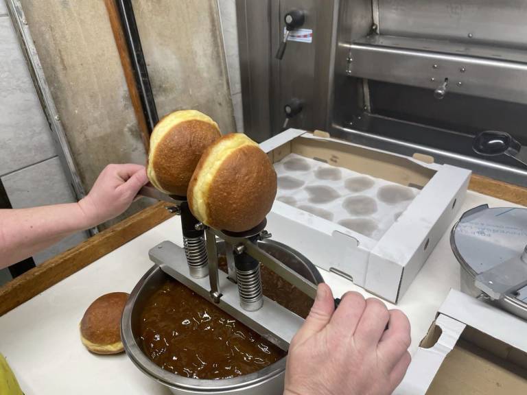Za polnjenje krofov uporabljajo posebno napravo, na katero namestijo krofe in jih s pritiskom navzdol napolnijo. Na koncu jih še posladkajo s sladkorjem v prahu in krofi so pripravljeni.