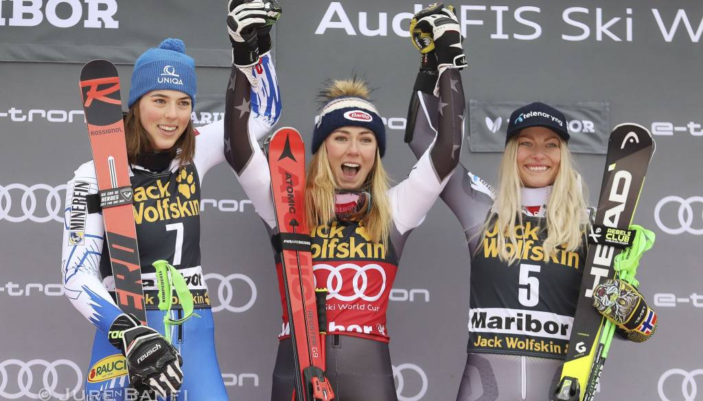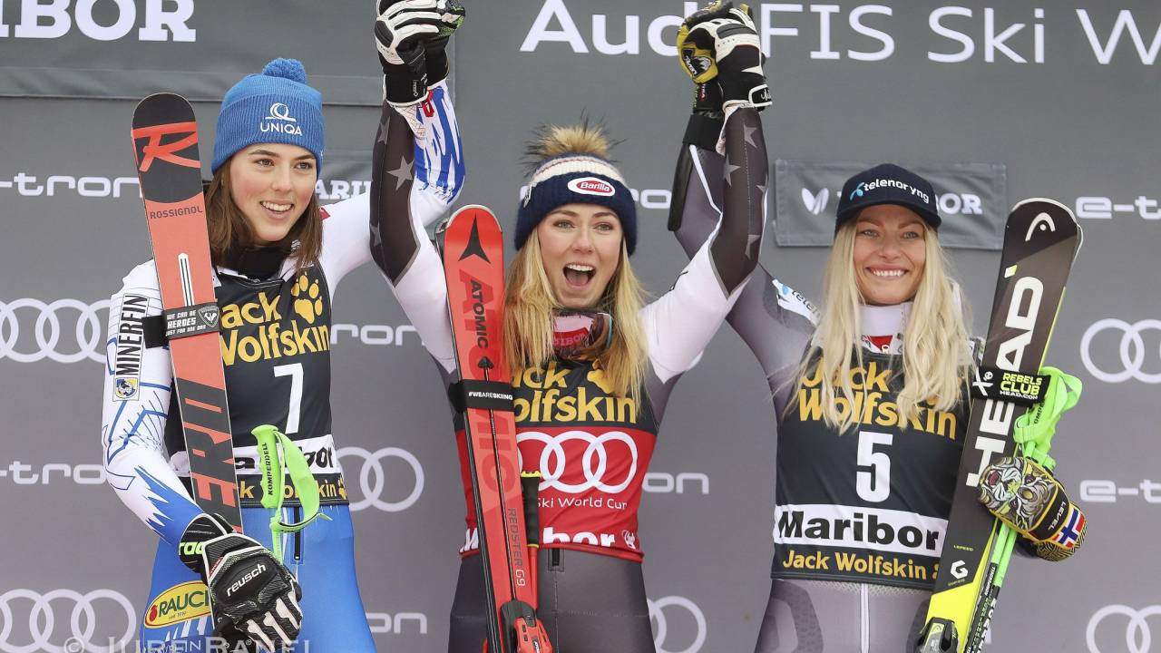 Američanka Mikaela Shiffrin nadaljuje z odličnimi predstavami v letošnji zimi, po prvi vožnji veleslaloma za svetovni pokal v Mariboru je vodila, a na prvi stopnički se ji je po drugi vožnji pridružila še Petra Vlhova.