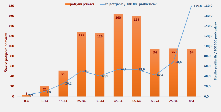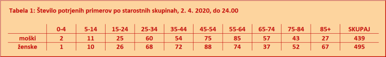 Med COVID-19 pozitivnimi je 439 moških in 495 žensk. Pozitivni primeri COVID-19 so po starostnih skupinah: