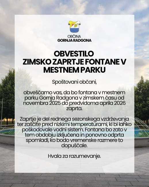 Občina Gornja Radgona obvešča, da bo fontana v mestnem parku Gornja Radgona zaprta v zimskem času od novembra do predvidoma aprila 2026.