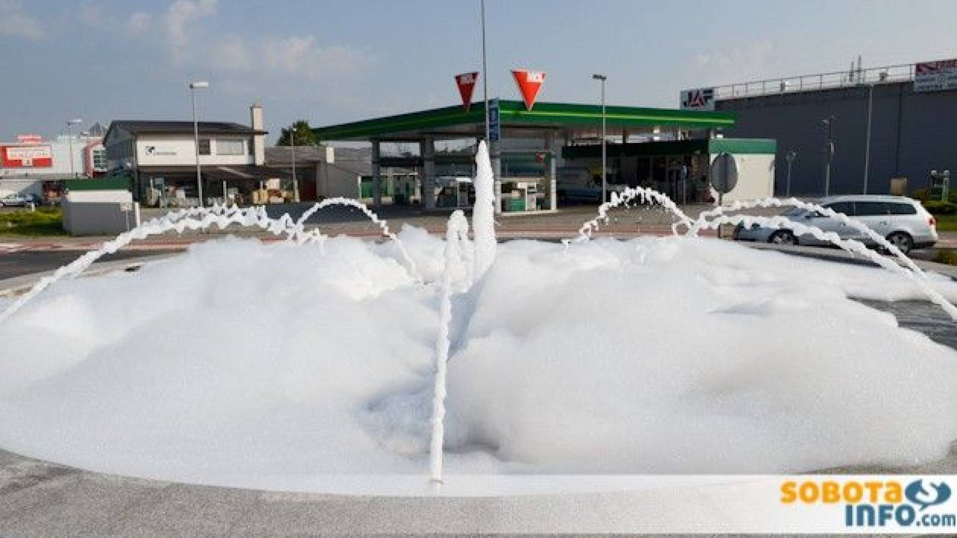 Šaljivci so si zopet privoščili fontano pri murskosoboškem BTCju. V vodo so zmešali penečo se snov.