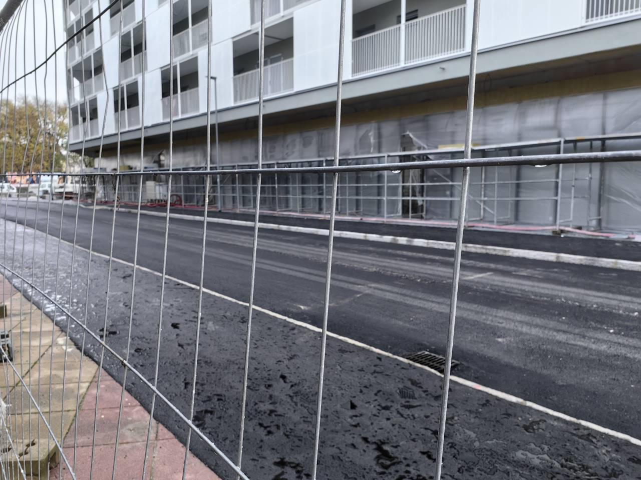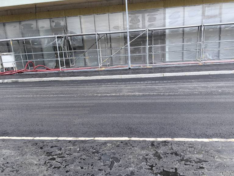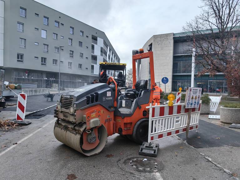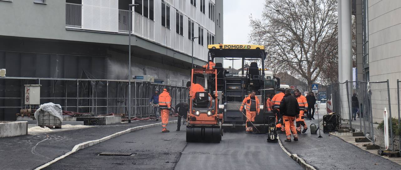 Na terenu je bilo mogoče opaziti več skupin delavcev in gradbeno mehanizacijo, ki je polagala nov asfalt na delu prometne ureditve ob objektu.