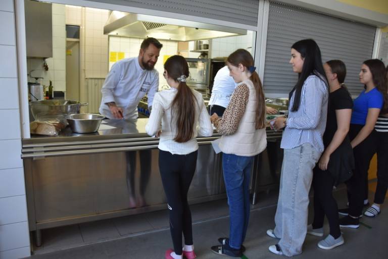 Slednji je sodeloval pri pripravi kosila. Med obiskom je razkril, da je na šolskem jedilniku najbolj oboževal grahovo mlečno juho.