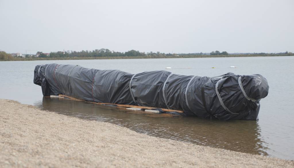 Čoln deblak, ki so ga v soboto v poznih večernih urah prepeljali na Soboško jezero so sedaj zaščitili s folijo, iščejo pa primerno mesto za potop.