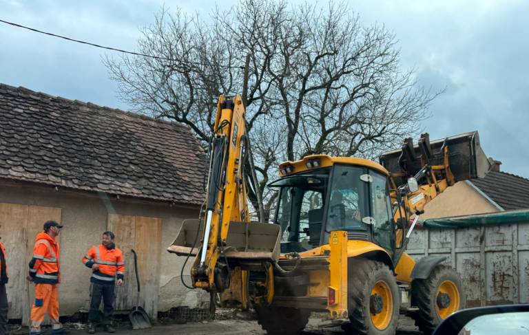 Bager čisti notranjost in dvorišče starejše hiše, ki je že dlje časa kazila podobo mesta, smeti pa nalagajo v kontejner.