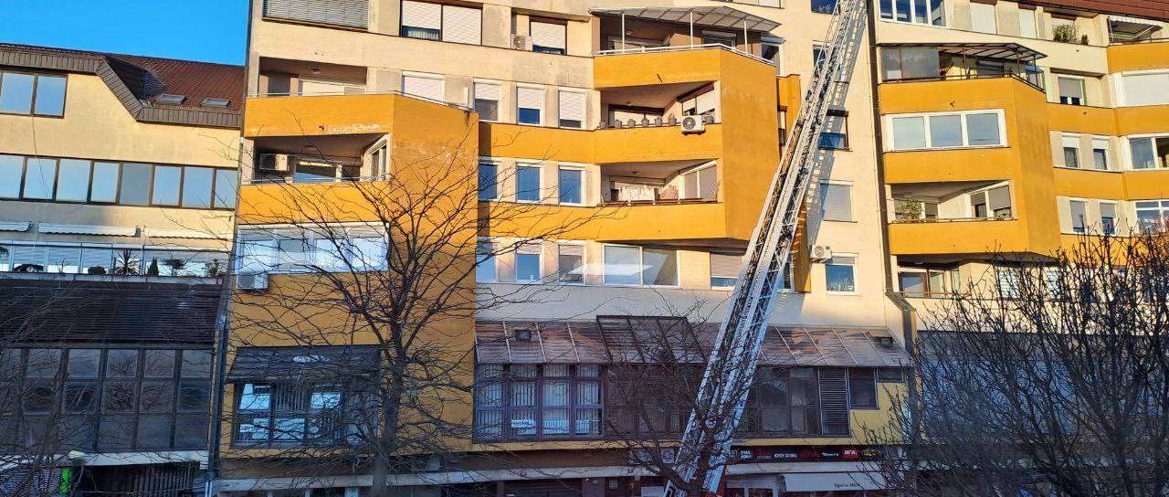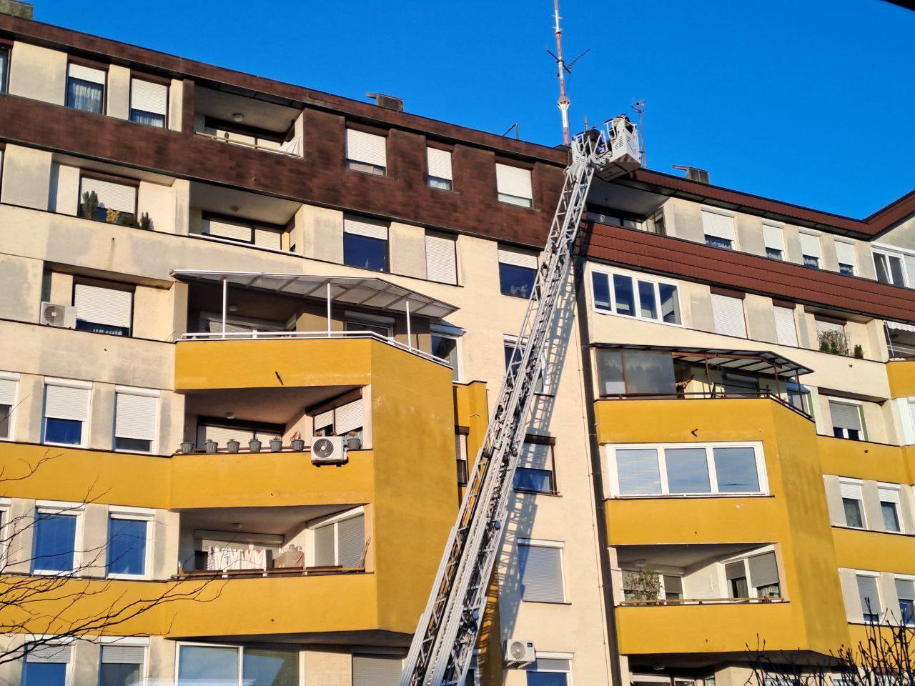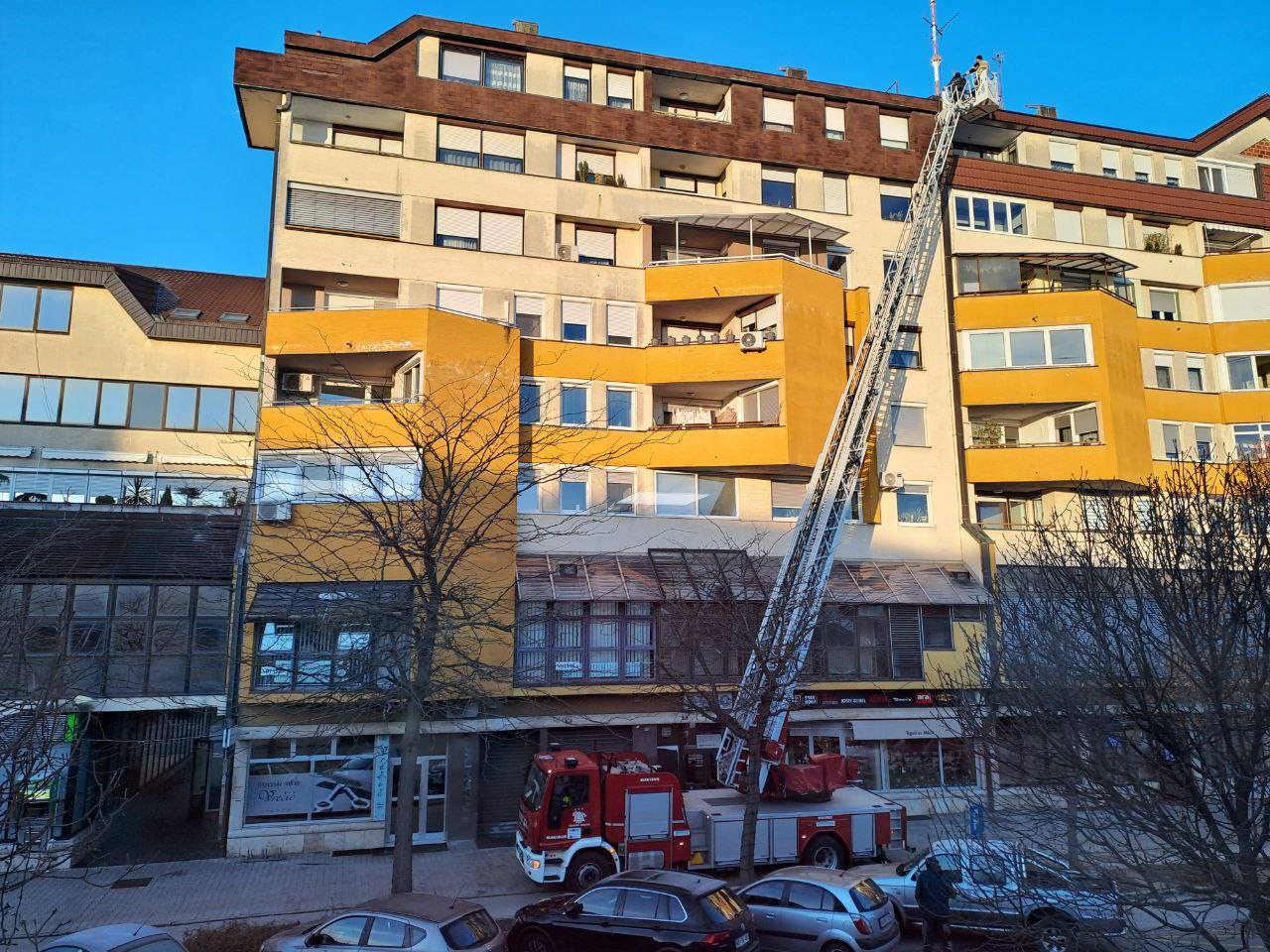 Mimoidoči na Kocljevi ulici v Murski Soboti so danes opazili gasilsko vozilo z raztegljivo lestvijo, ki je segla vse do vrha stanovanjskega bloka.