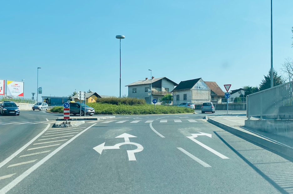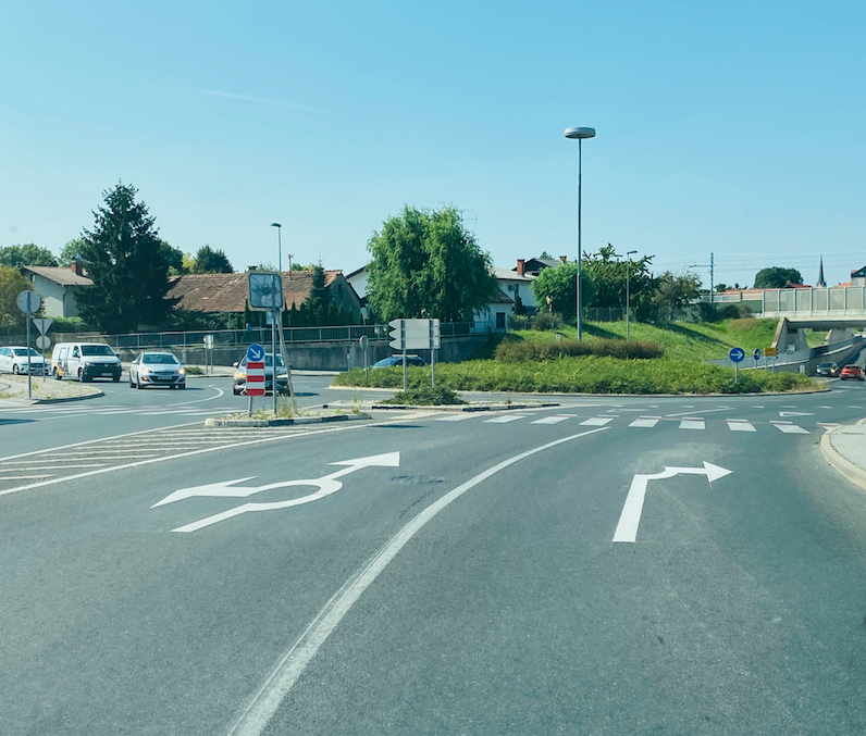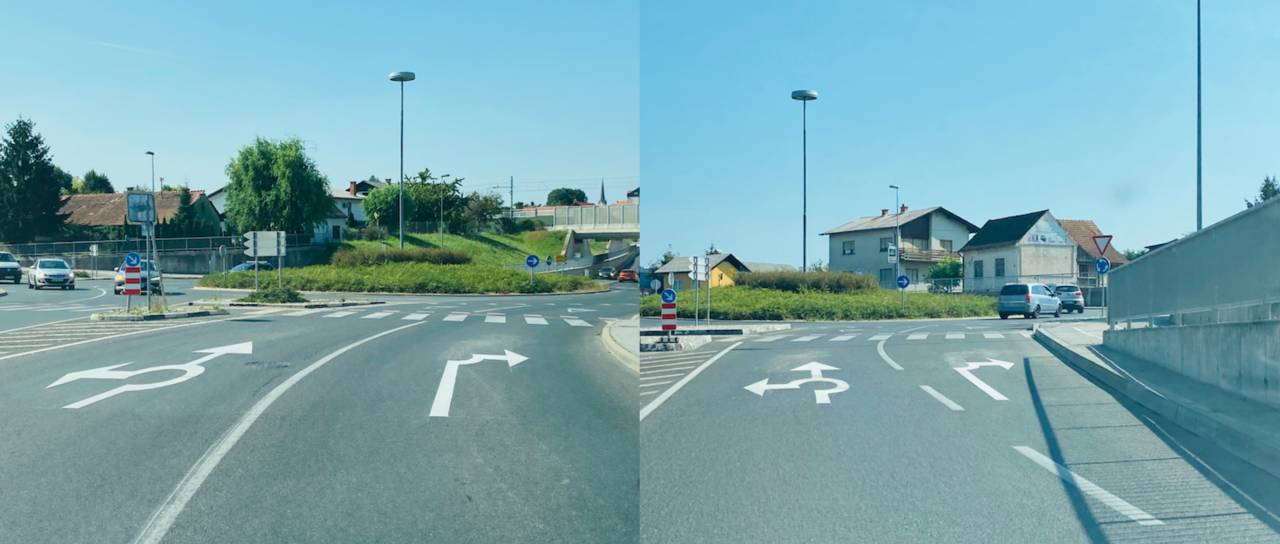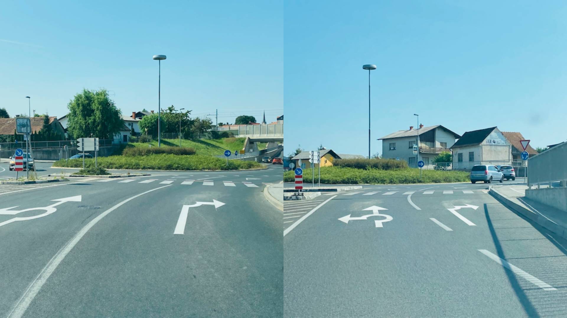 Spomnimo, da so puščice v krožišču na obeh pasovih bile enake in označevale, da je treba pri prvem izvozu zapeljati iz krožišča. Kar pomeni, da če bi upoštevali narisane označbe, ni bilo mogoče peljati dlje kot do prvega izvoza.
