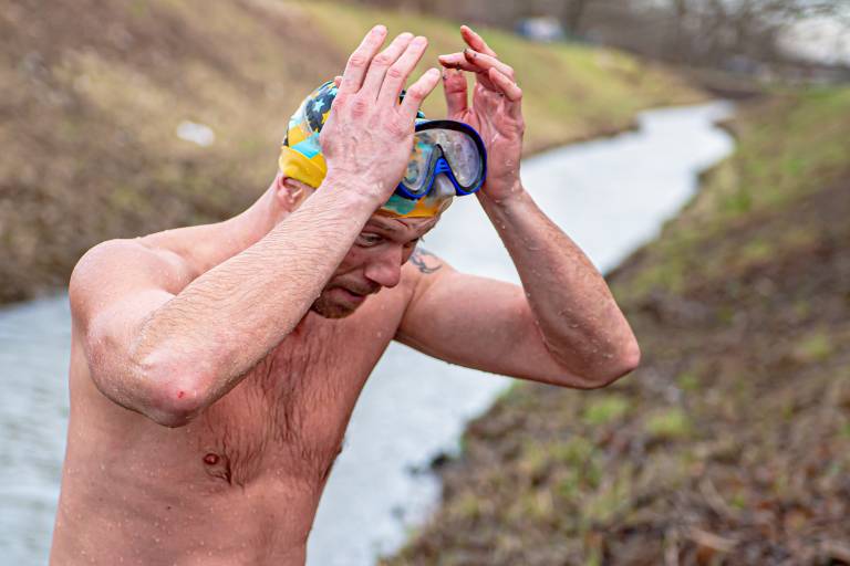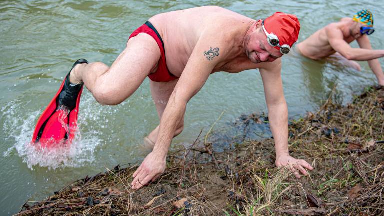 Nekaj pogumnežev se je na današnji prvi dan v letu pognalo v ledeno hladno Ledavo, saj je bila tradicionalna prireditev novoletnega skoka v Soboško jezero odpovedana.