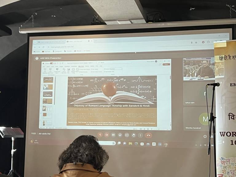 V osrednjem delu je sledilo predavanje preko spletnega orodja Zoom, strokovnjaka za hindi jezik in kulturo Zameerja Anwarja, ki je podrobneje predstavil povezave med romskim in hindujskim jezikom.