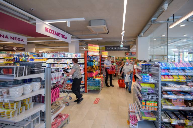 Posebna pozornost je namenjena svežemu programu, sveži ponudbi kruha in pekovskega peciva, pisani ponudbi sadja in zelenjave, kjer je velik poudarek na izdelkih slovenskih pridelovalcev.