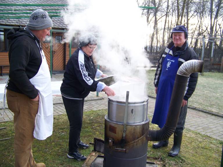 Zadišalo je po bujti repi, praženi ajdovi kaši z svinjskimi jetri, pečenem svinjskem mesu, krvavicah ter zelju s fižolom. Na voljo so imeli tudi domače vino in žganje, katerega so člani društva pridelali na Grüntu.