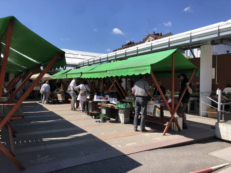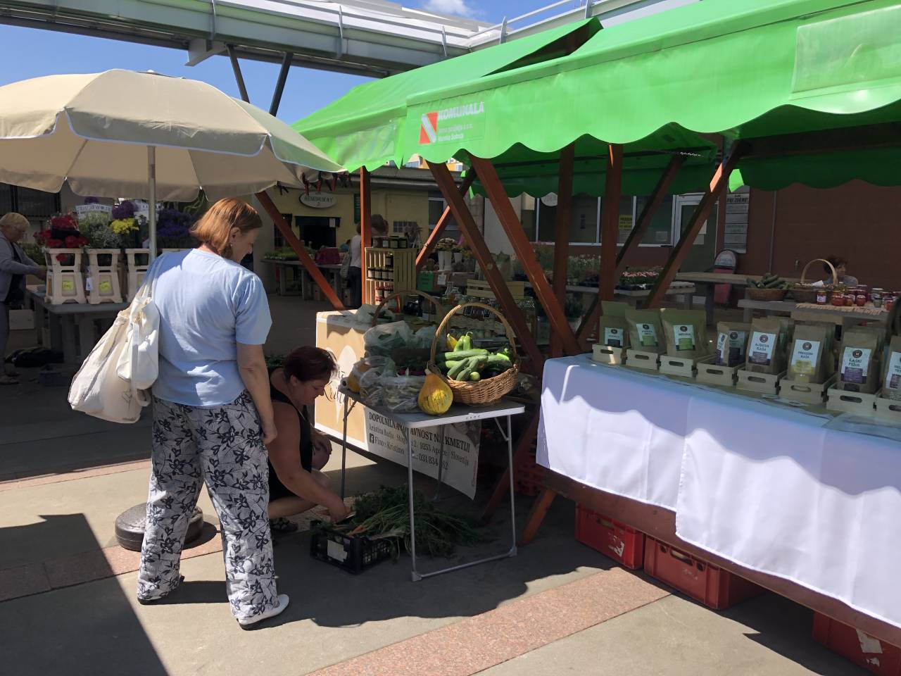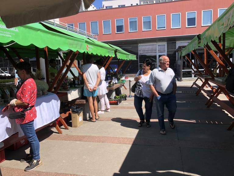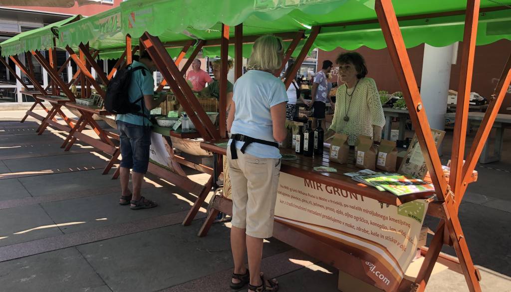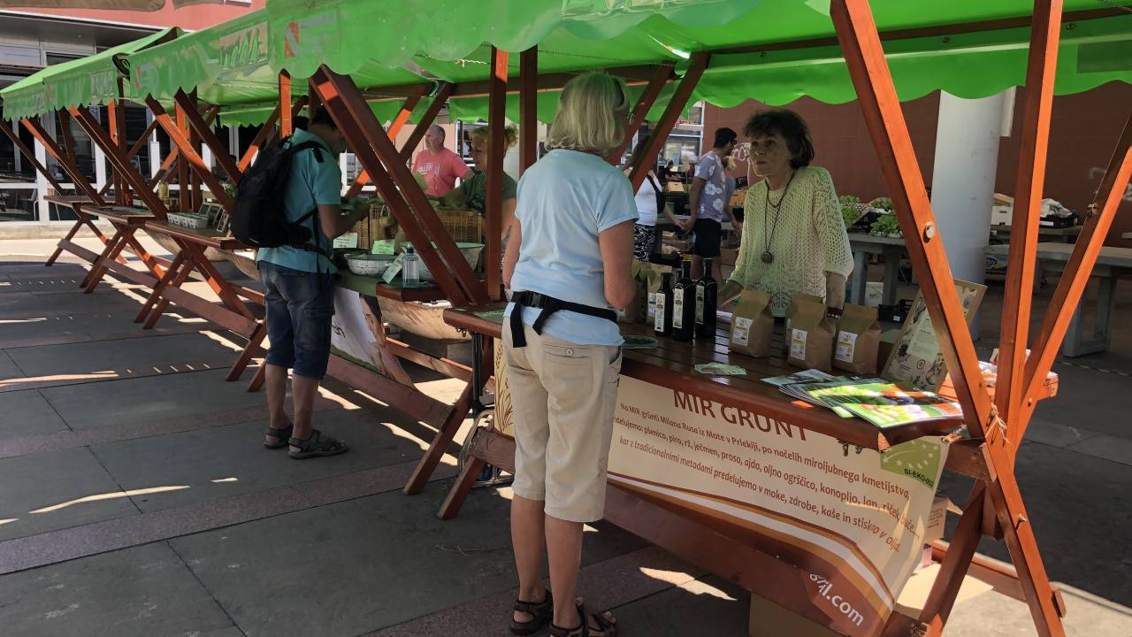 Pestra ponudba lokalnih pridelovalcev in predelovalcev na mestni tržnici.