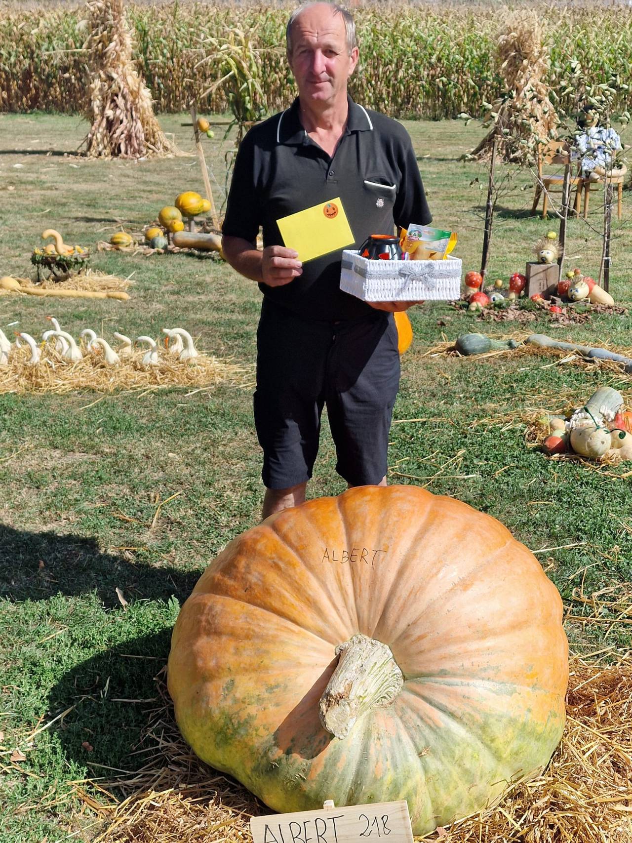 Najtežja buča, ki je tehtala kar 218 kilogramov in postavila nov rekord prireditve, je letos pripadla pridelovalcu Albertu Vrablju.