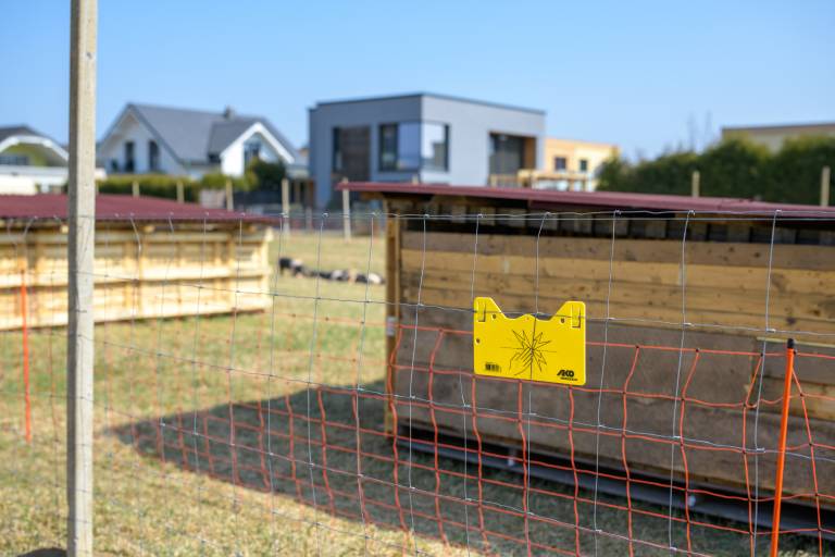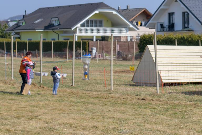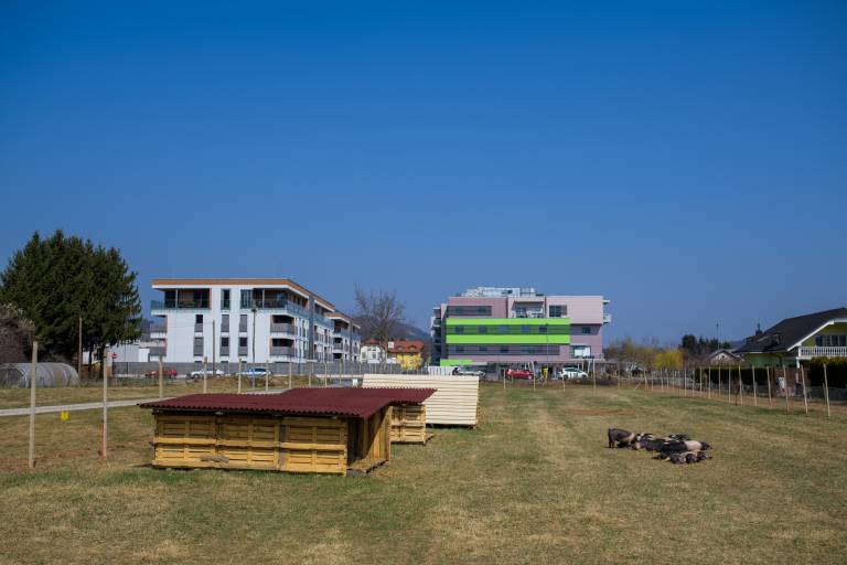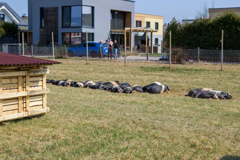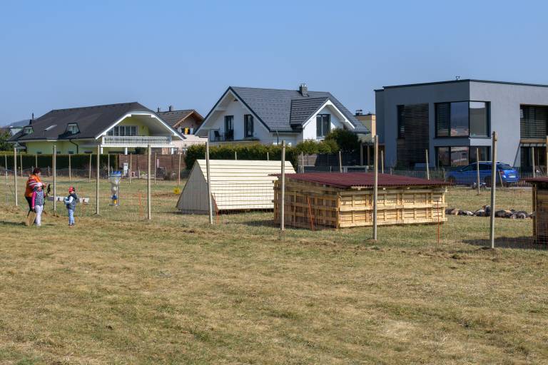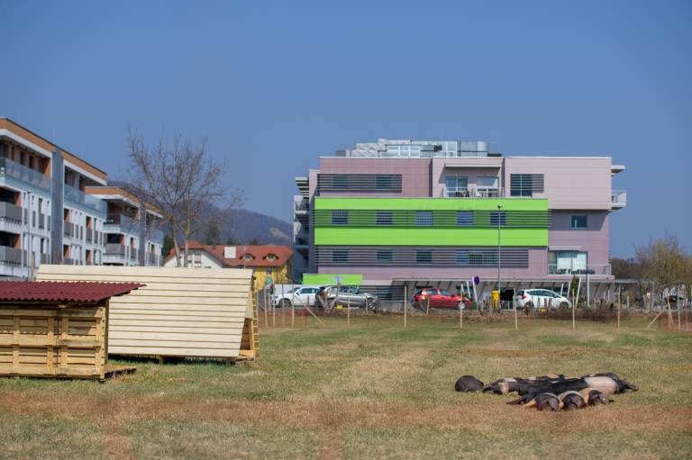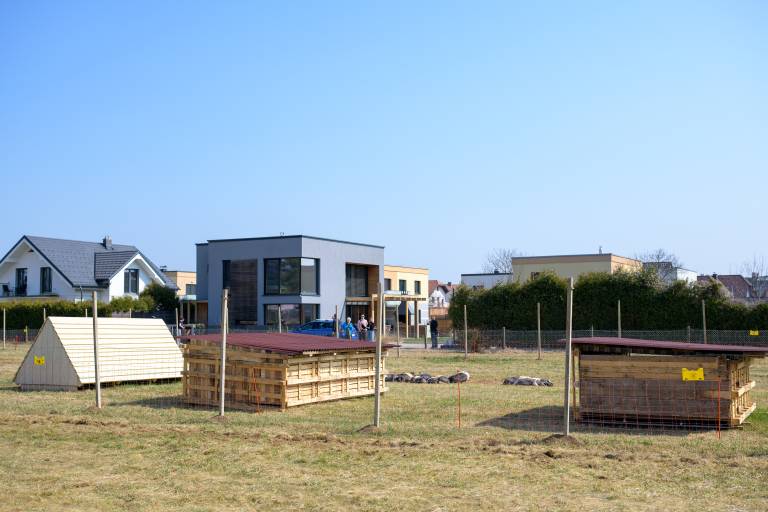 Na zelenici nasproti doma starejših so postavili lesene hiške, v katerih bodo prašiči spali, ali pa se v te umaknili ob slabem vremenu.