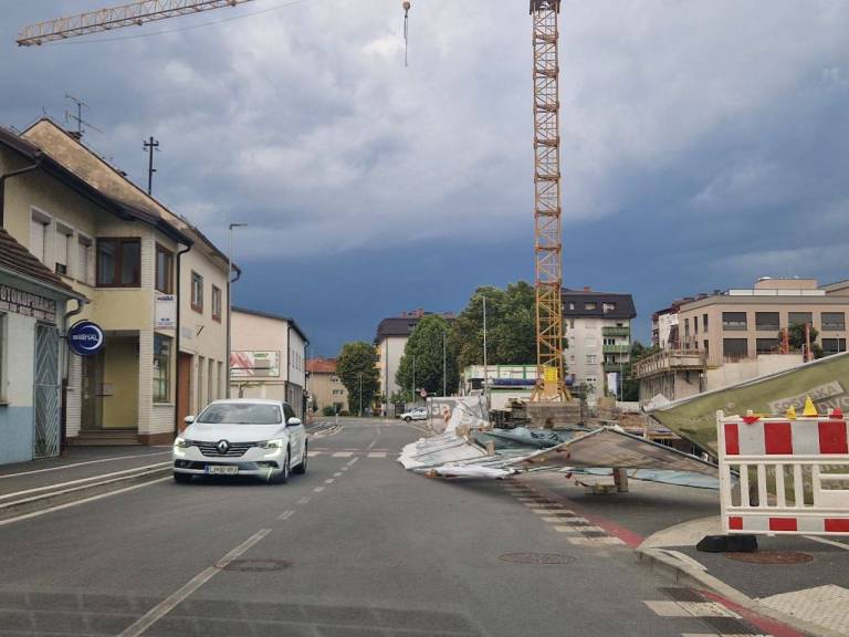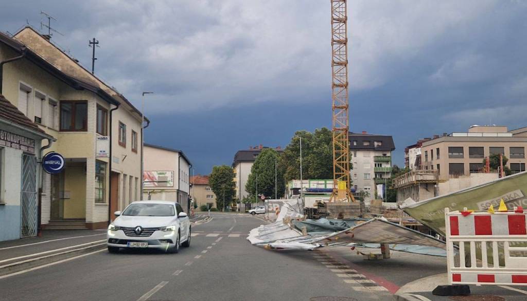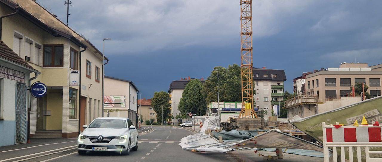 Nevihtni piš že povzroča težave, v centru Murske Sobote je prevrnilo zaščitno ogrado na gradbišču Zelenega dvora.