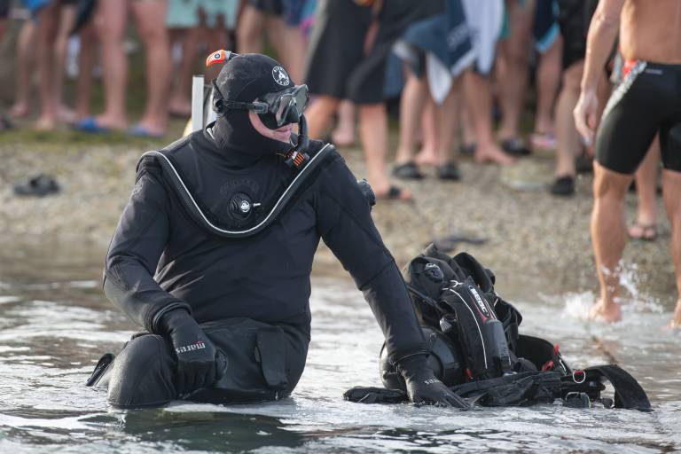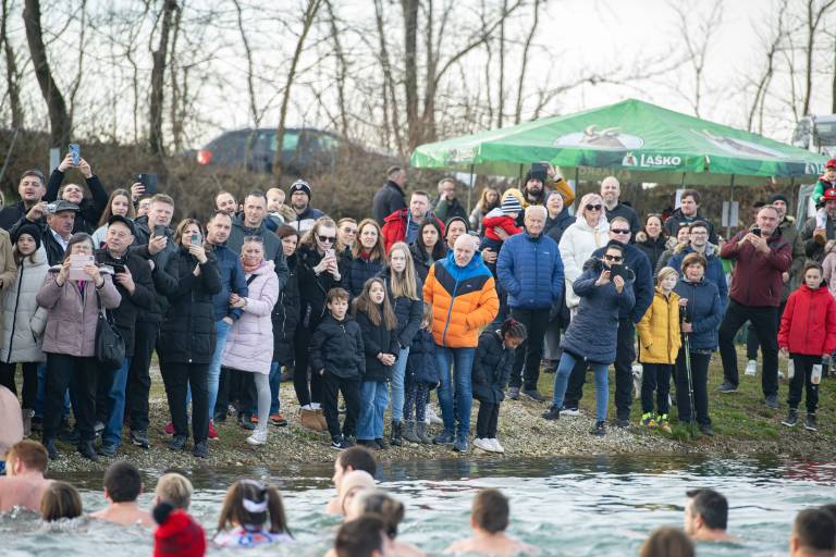 Tradicionalno novoletno plavanje je privabilo pogumne plavalce in radovedne gledalce.