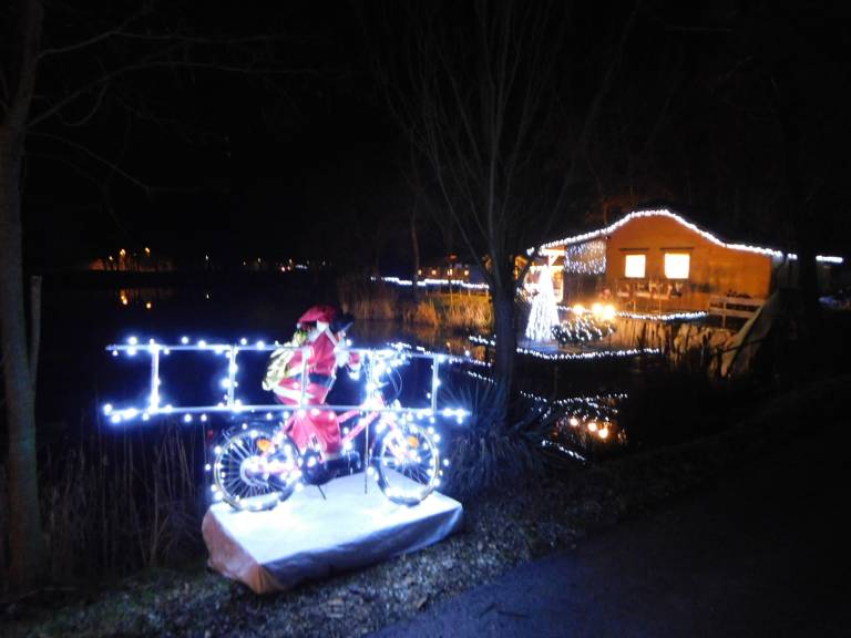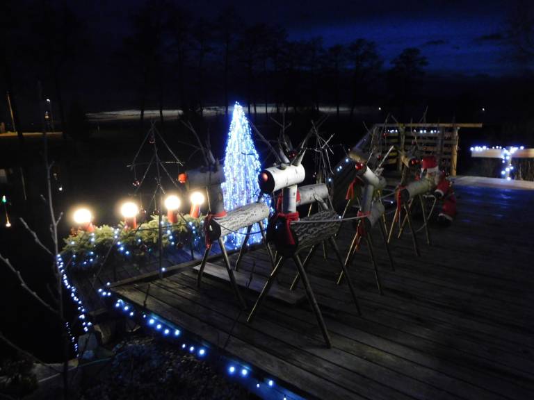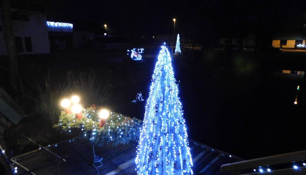 Ribiška brunarica in okolice Magdičeve grabe, brežine in zaščitne ograje so ponoči vse osvetljene z lučkami v dolžini 400 metrov, postavljene pa so tudi svetlobne smreke.