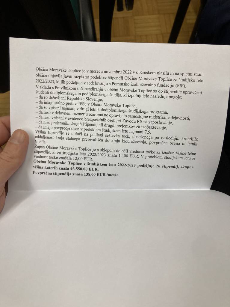 Občina Moravske Toplice štipendije podeljuje v sodelovanju s Pomursko izobraževalno fundacijo (PIF).