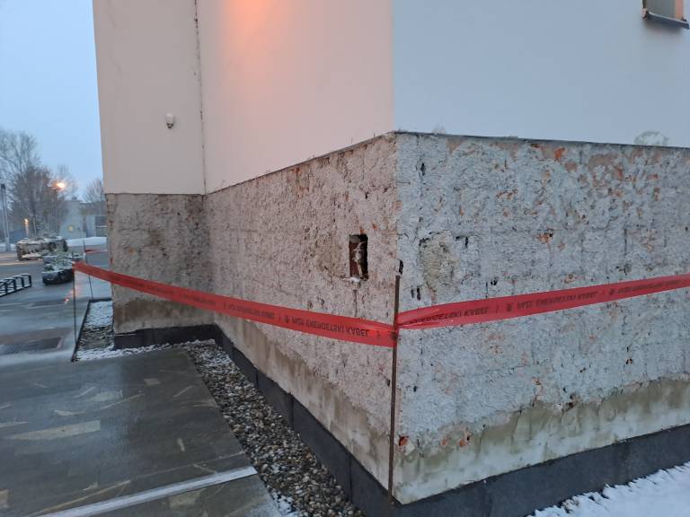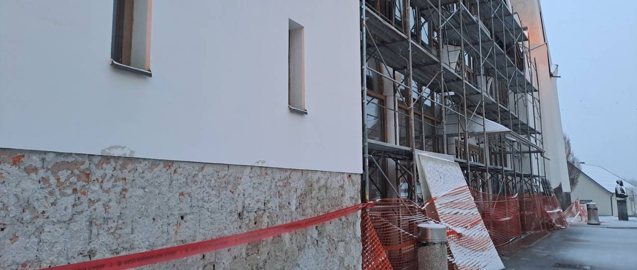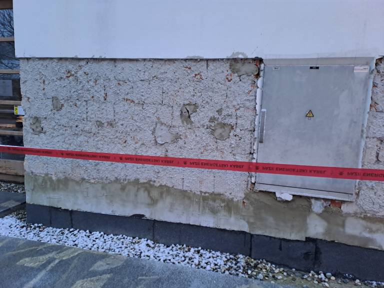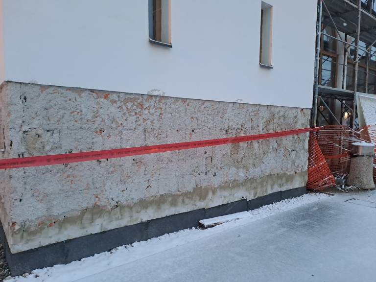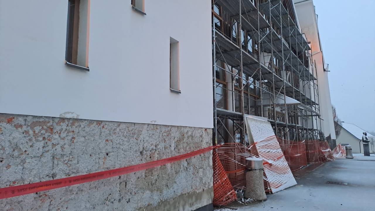 - Odstranjena je fasada v spodnjem pasu objekta, kjer bo sledila sanacija in nova zaščitna plast,