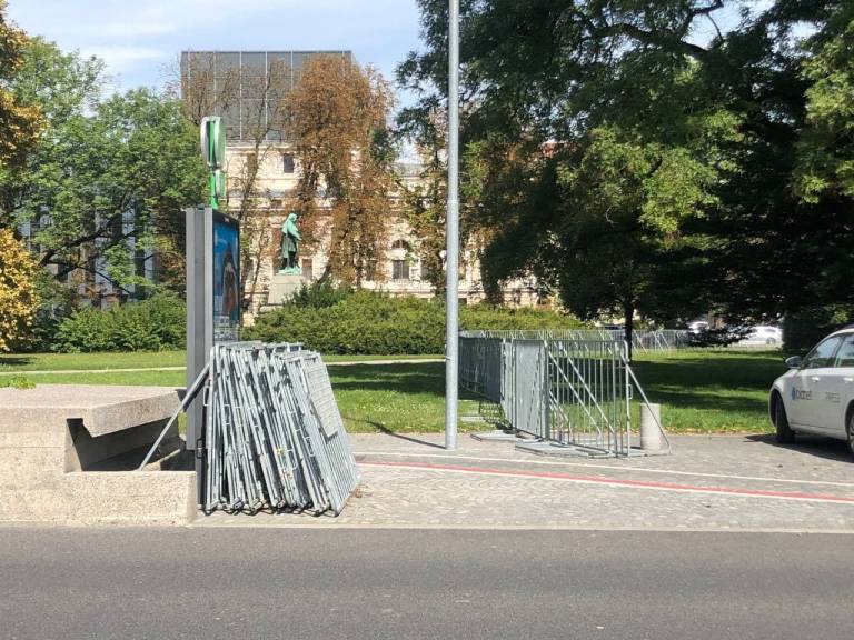 Nekatere ograje, ki so še včeraj samo slonele ob Trgu Republike, so danes že postavljene.