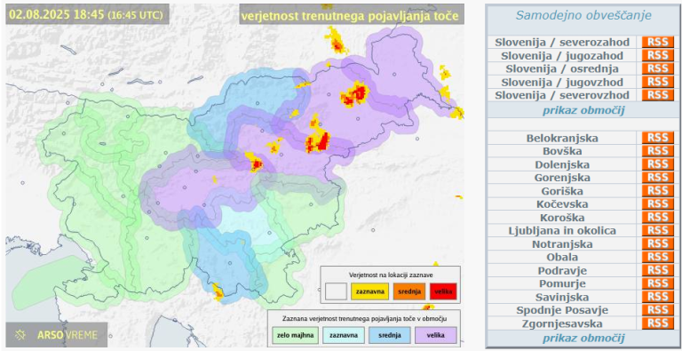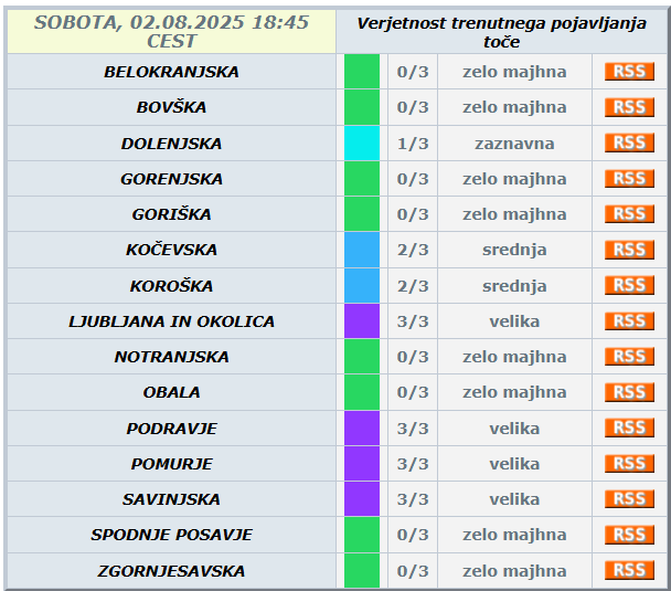 Po podatkih Agencije Republike Slovenije za okolje je verjetnost pojavljanja toče največja v regijah Pomurje, Podravje, Savinjska, Spodnje Posavje in Ljubljana z okolico, kjer je stopnja nevarnosti označena z najvišjo možno stopnjo.