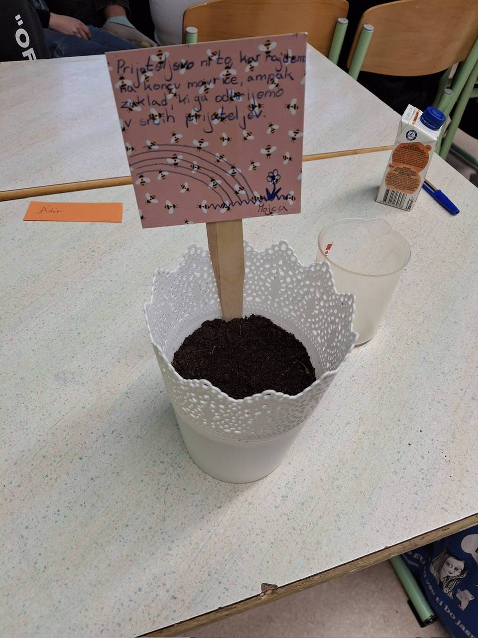 Pri zadnji aktivnosti so izbrali sebi najljubšo misel v svojem jeziku, jo prilepili na že pripravljeno leseno palčico in jo zapičili v sveže zasajeni cvetlični lonček, ki so ga dali v dar učencu, s katerim so bili v paru.