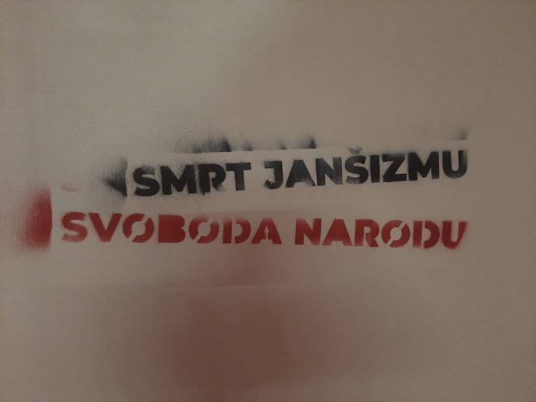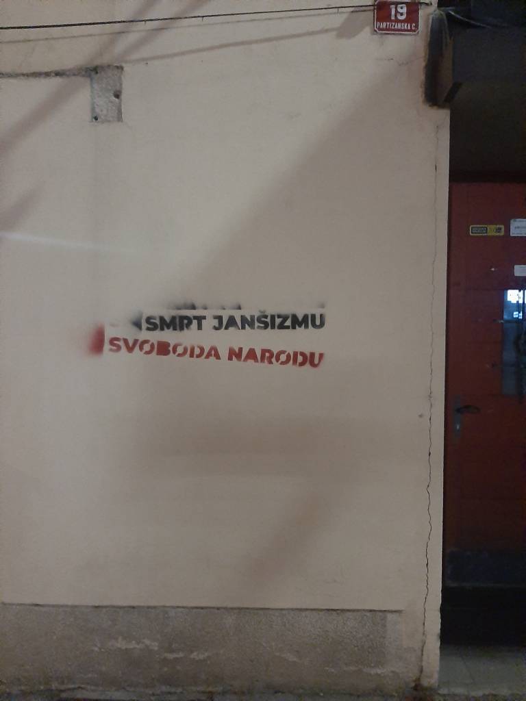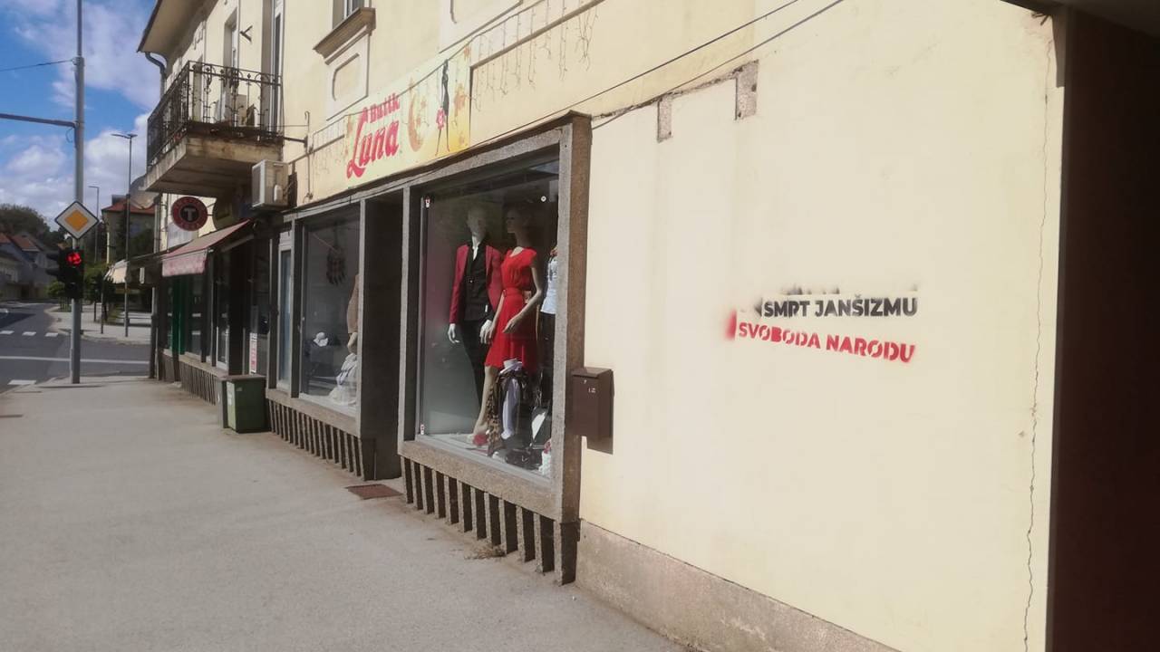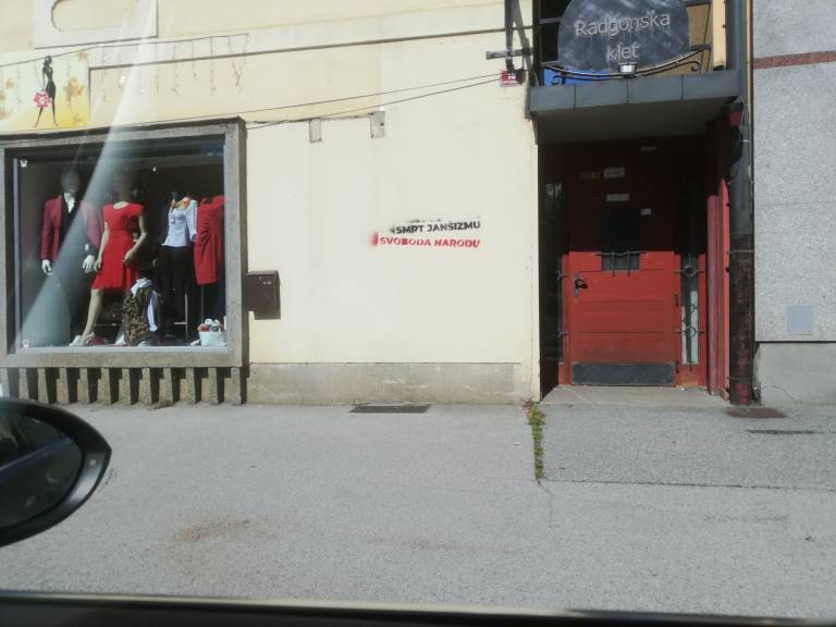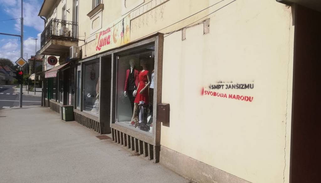 V središču Gornje Radgone razburja zapis, ki se glasi: »Smrt janšizmu, svoboda narodu.«