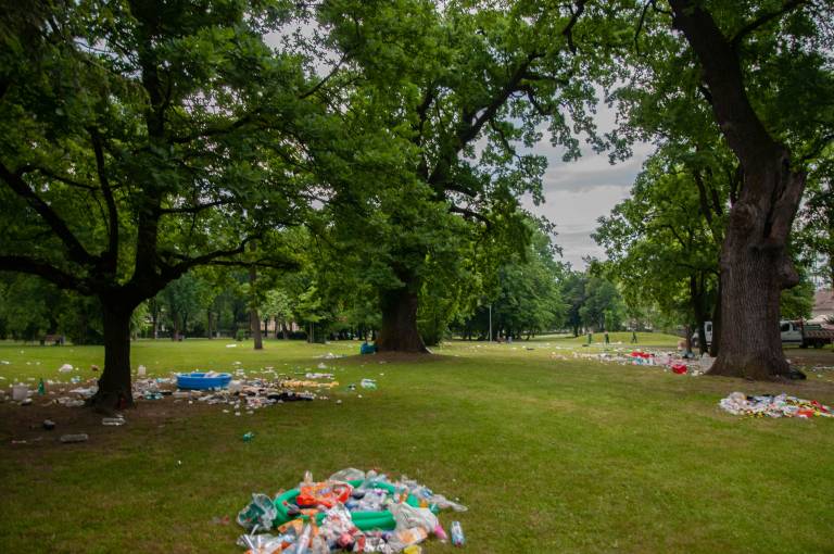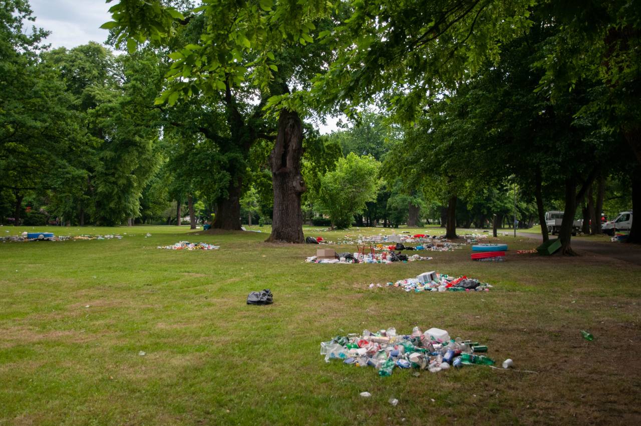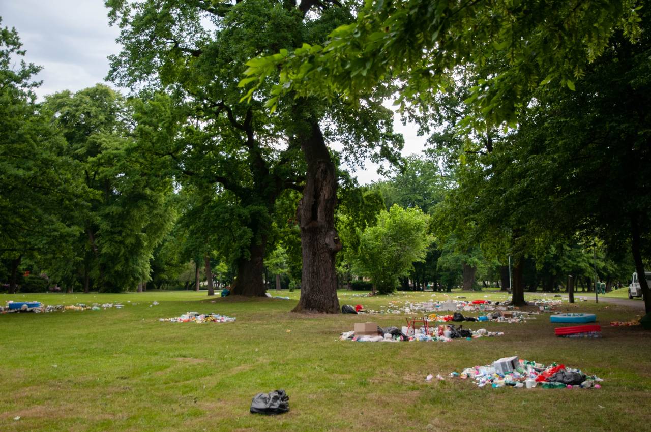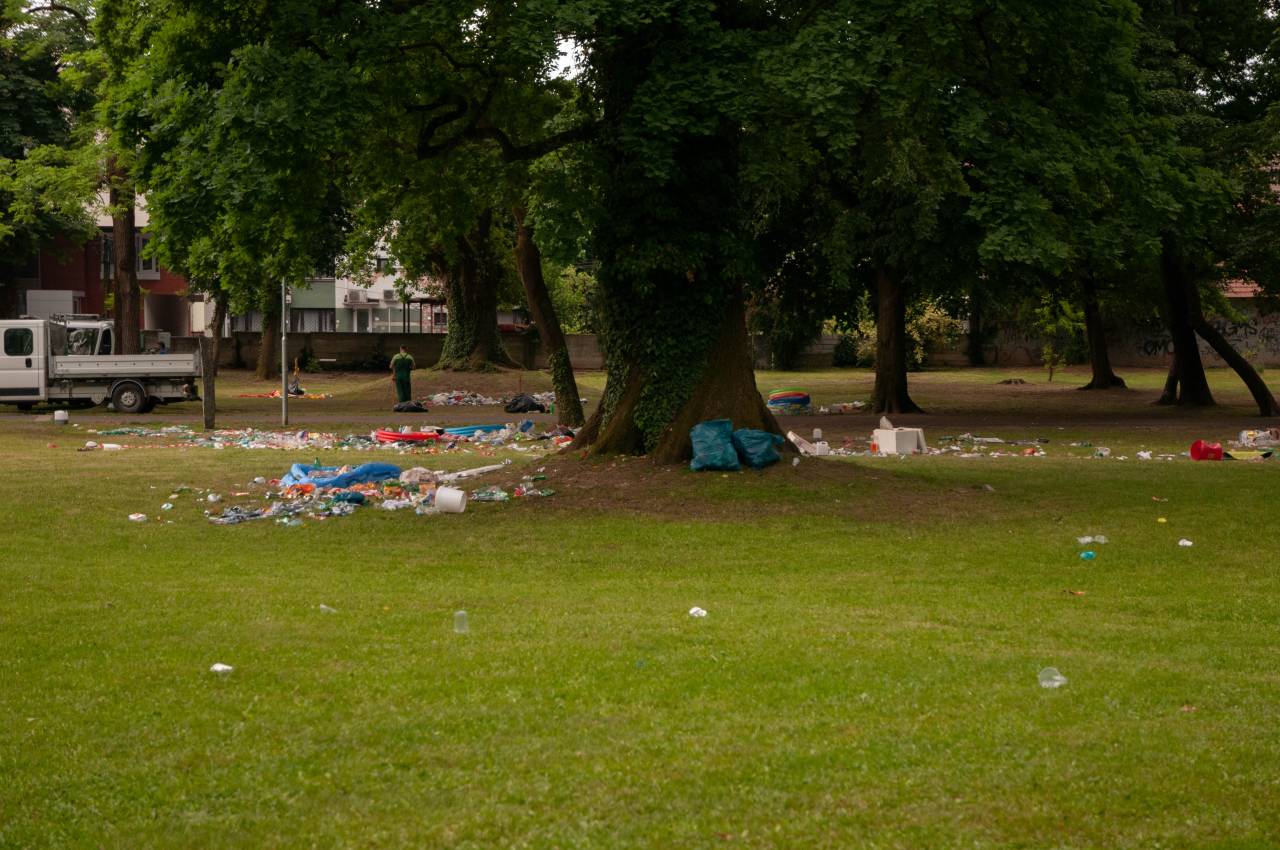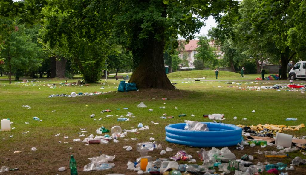 Po celem parku je bilo namreč zjutraj razmetanih na kupe smeti. Na tleh je ležalo vse od plastenk, bazenov, pa vse do vrečk, steklenic, hrane, trakov, šotorov, embalaže in ostalih odpadkov. Je tovrstno početje res potrebno?
