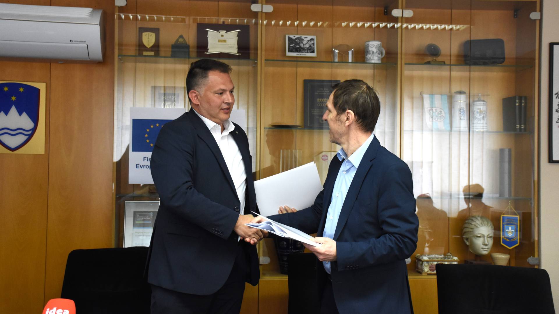 Župan Mestne občine Murska Sobota Damjan Anželj in član uprave podjetja Pomgrad Boris Sapač sta podpisala pogodbo za izvedbo gradbenih del projekta Noršinska ulica prva faza.