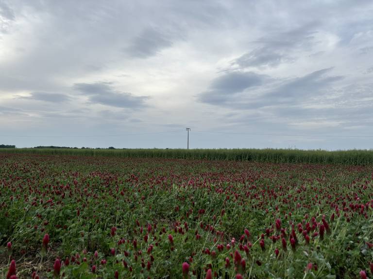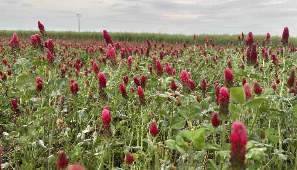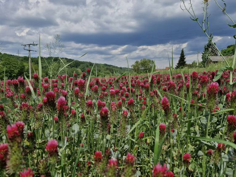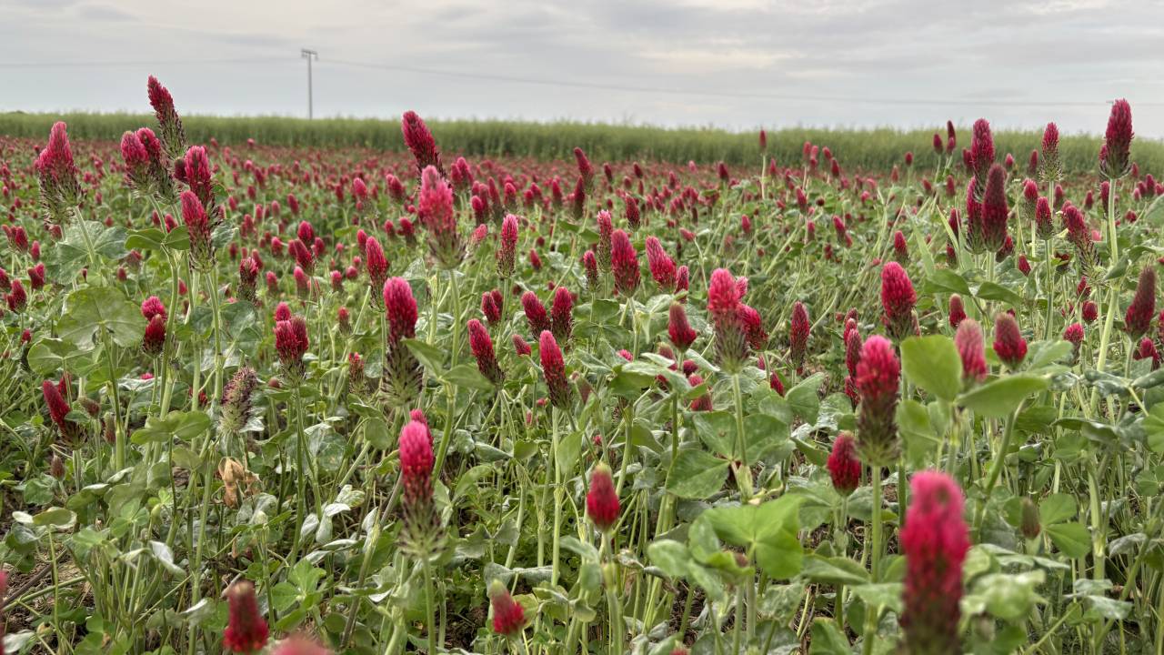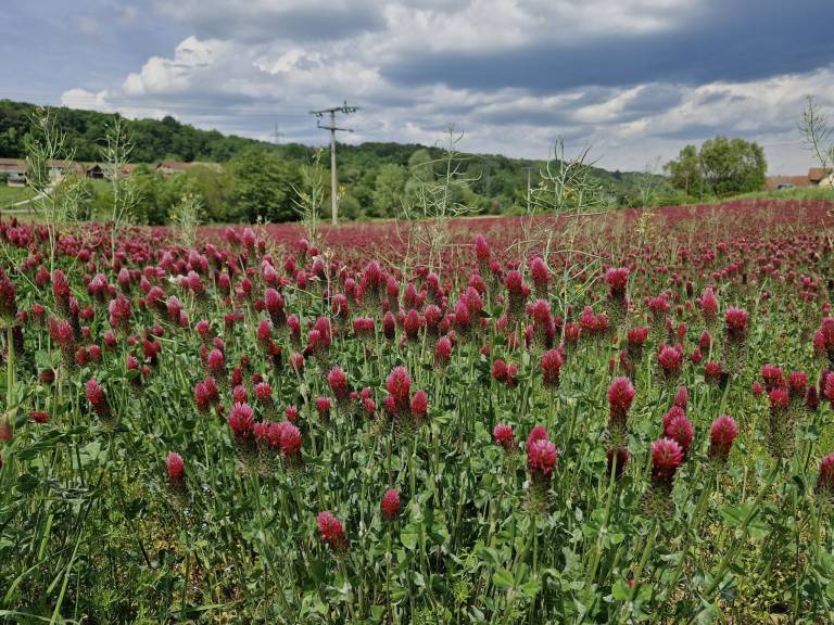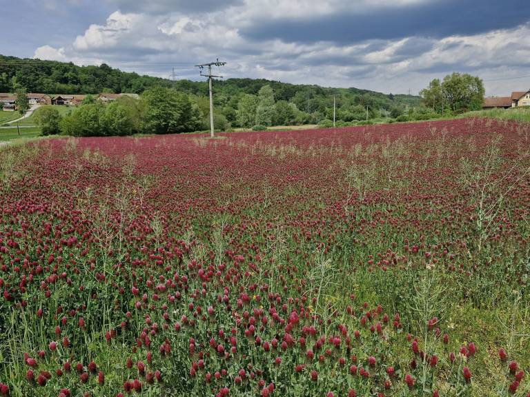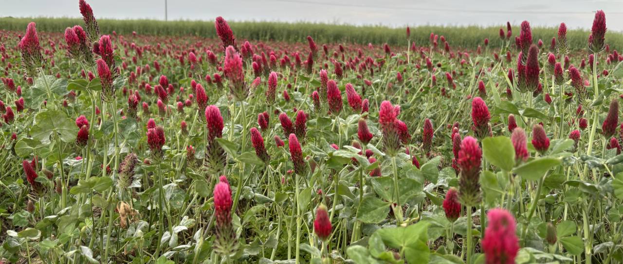 Na kmetijskih površinah v Pomurju trenutno cveti tudi avtohtona sorta enoletne prezimne detelje Inkara, ki s svojimi škrlatno rdečimi cvetovi prekriva njive kot rdeča preproga.