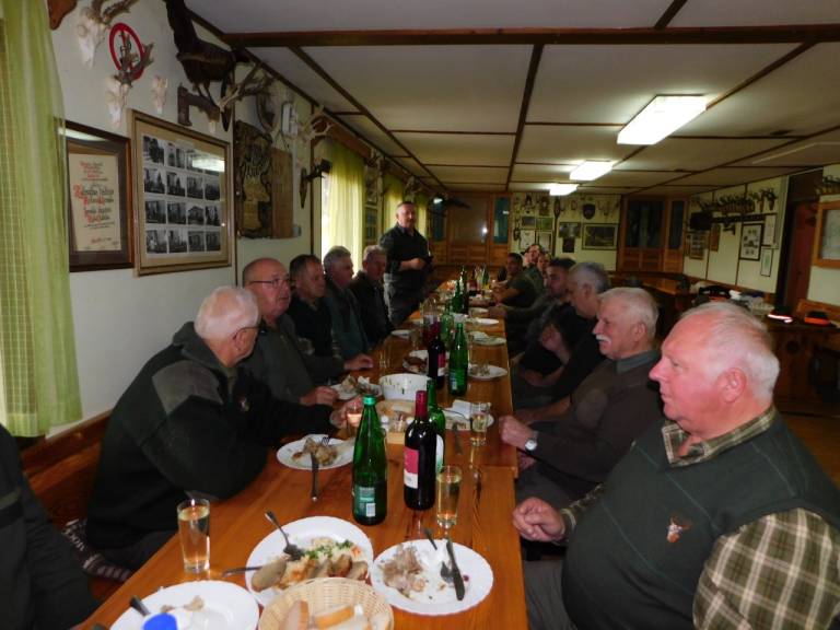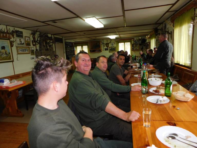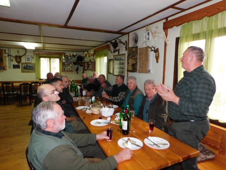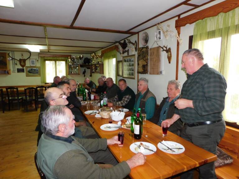 Ko je ura odbila 12.00, so se vsi zbrali pri lovskem domu, kjer so si od ulova malo odpočili, nato pa so odšli v lovski dom, kjer jim je društvo pripravilo slavnostno kosilo.