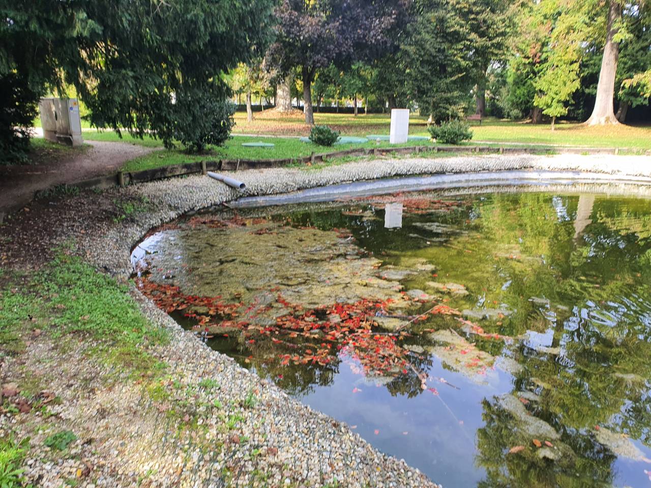Ribnik v mestnem parku v slabem stanju, vodomet ne deluje