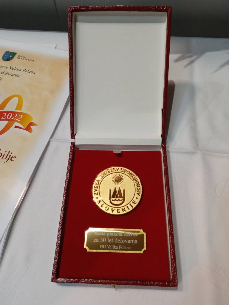 Ob jubilejnem praznovanju je društvo prejelo malo plaketo Zveze društev upokojencev Slovenije.