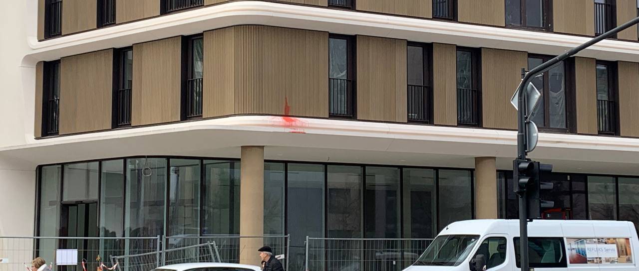Pred palačo Schellenburg pa je včeraj prišlo do incidenta. Neznanec je fasado prestižne soseske onečedil z rdečo barvo.