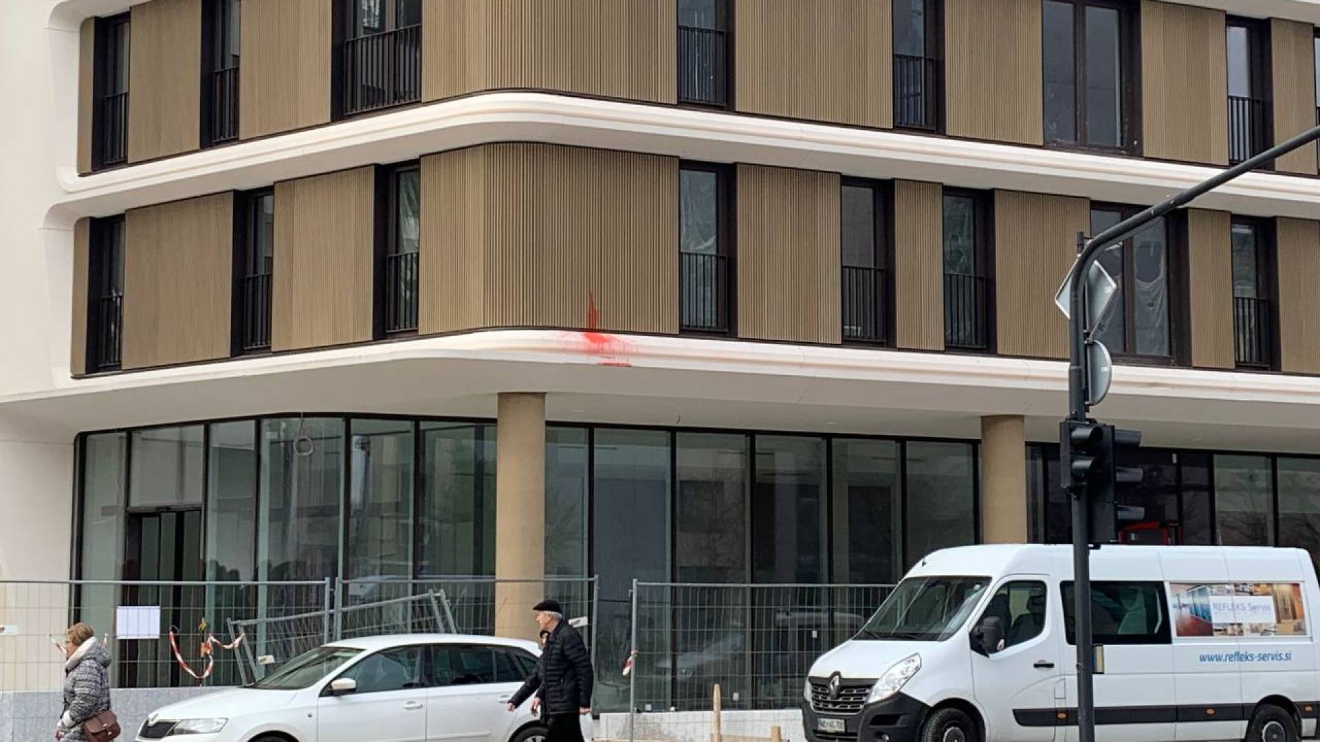 Na fasadi se je pojavila krvavo rdeča packa.