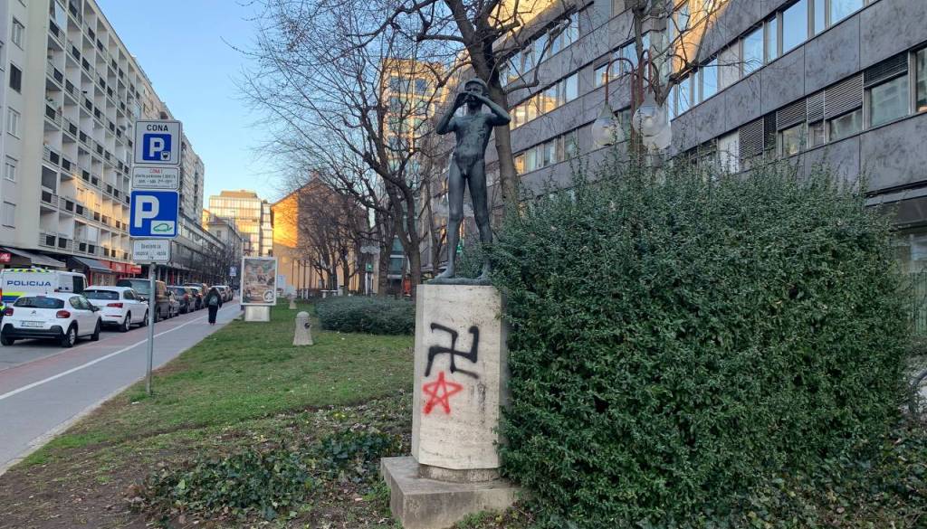A Dečka s piščalko ni »doletela« le vrečka s smetmi: podstavek, na katerem stoji, je nekdo porisal s kljukastim križem in rdečo zvezdo. Oba simbola smo opazili tudi na asfaltu v bližini.