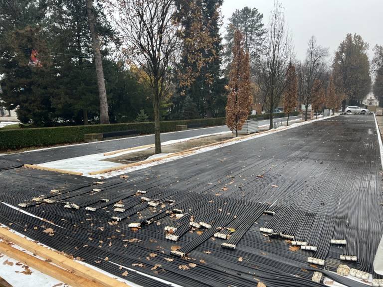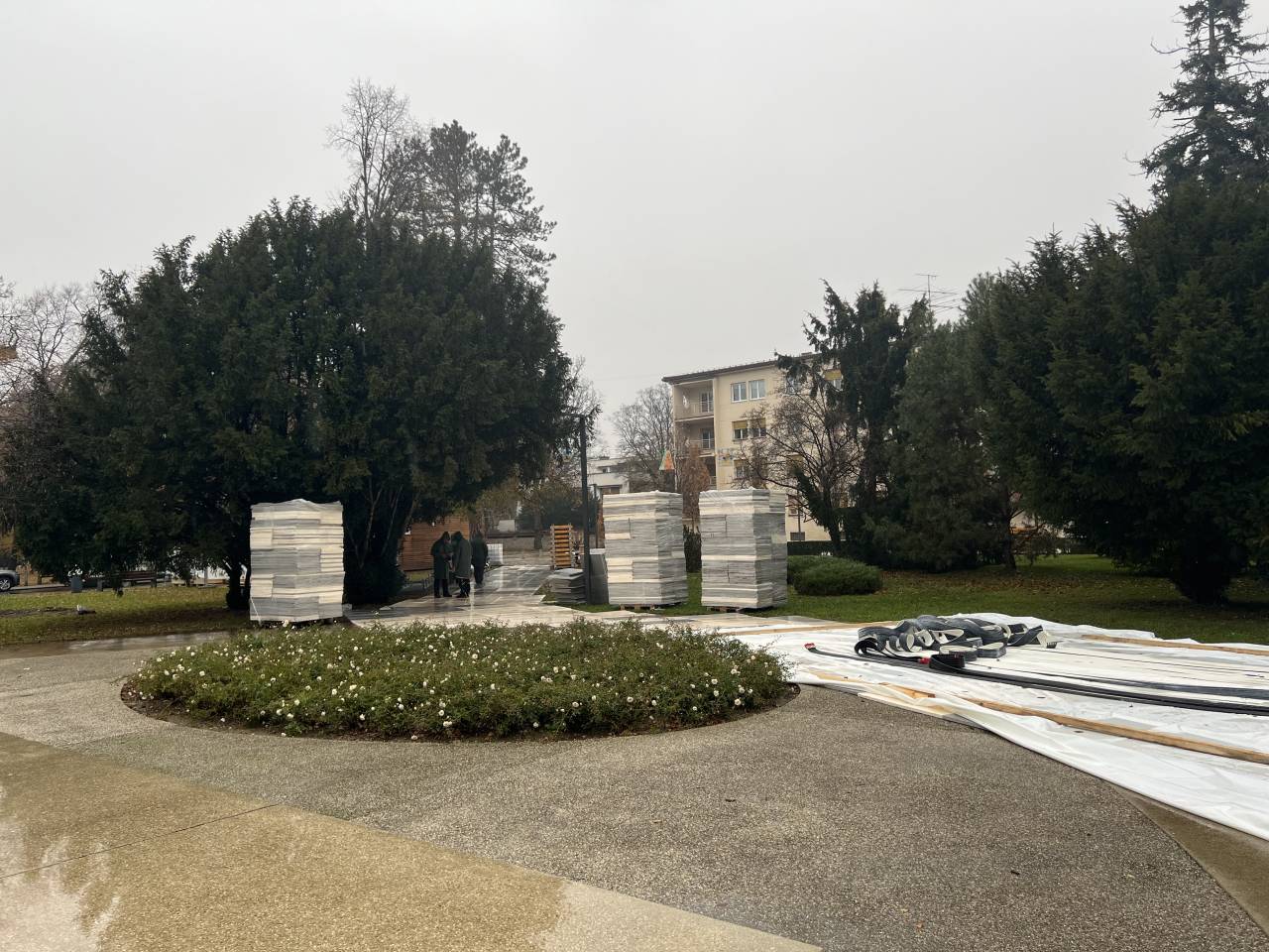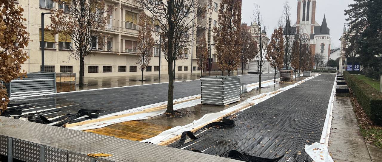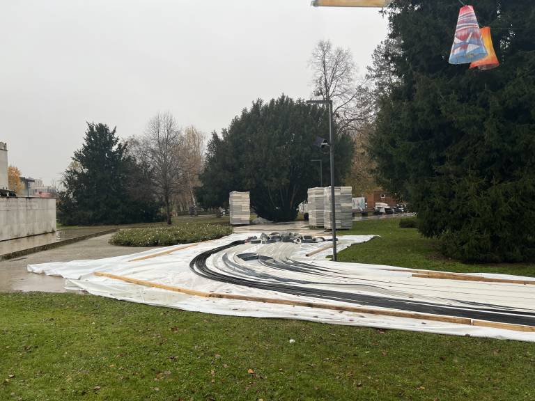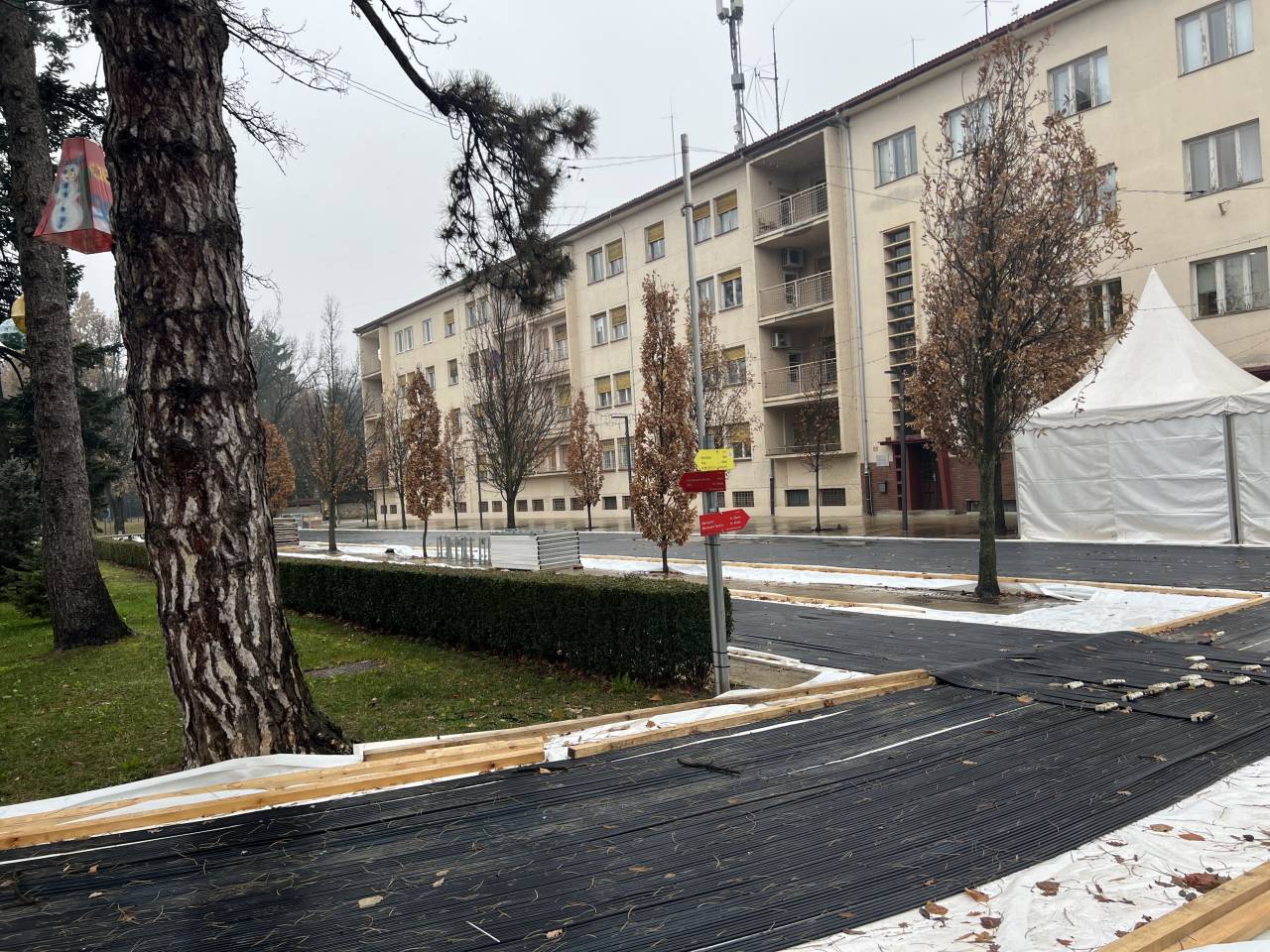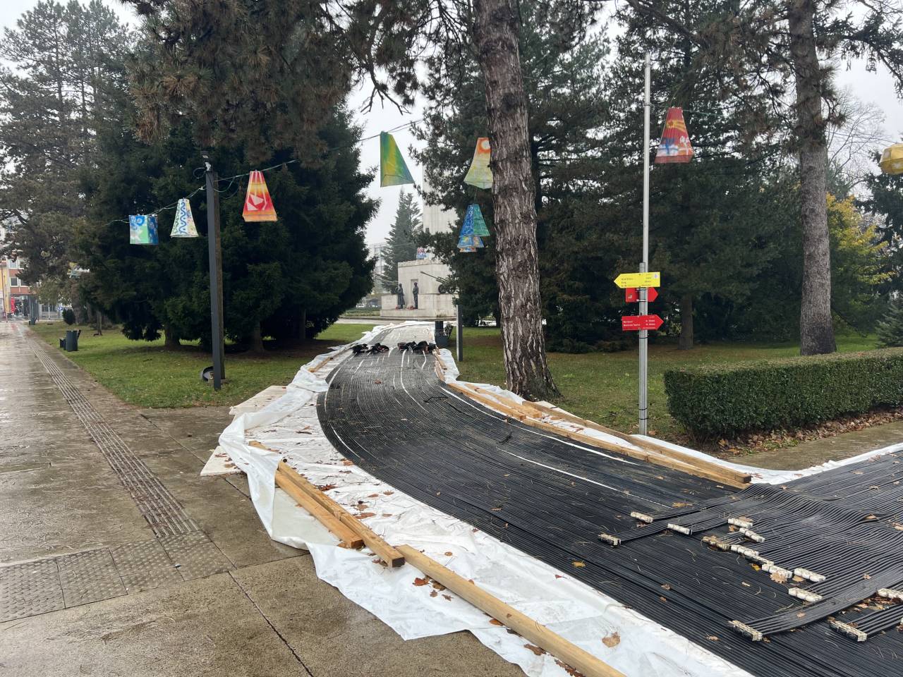 Vidno je, da je osrednji del drsališča na ploščadi ob Drevoredu Martina Luthra, kjer bosta potekali dve progi, v osnovi že pripravljen, sedaj pa dela primarno potekajo na dodatni krožni stezi, ki je speljana do spomenika zmage.