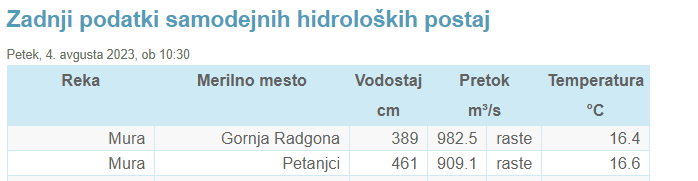 Zadnje meritve pretoka so bile objavljene ob 10.30. V Gornji Radgoni ima reka Mura pretočnost 982,5 kubičnega metra na sekundo in še raste.