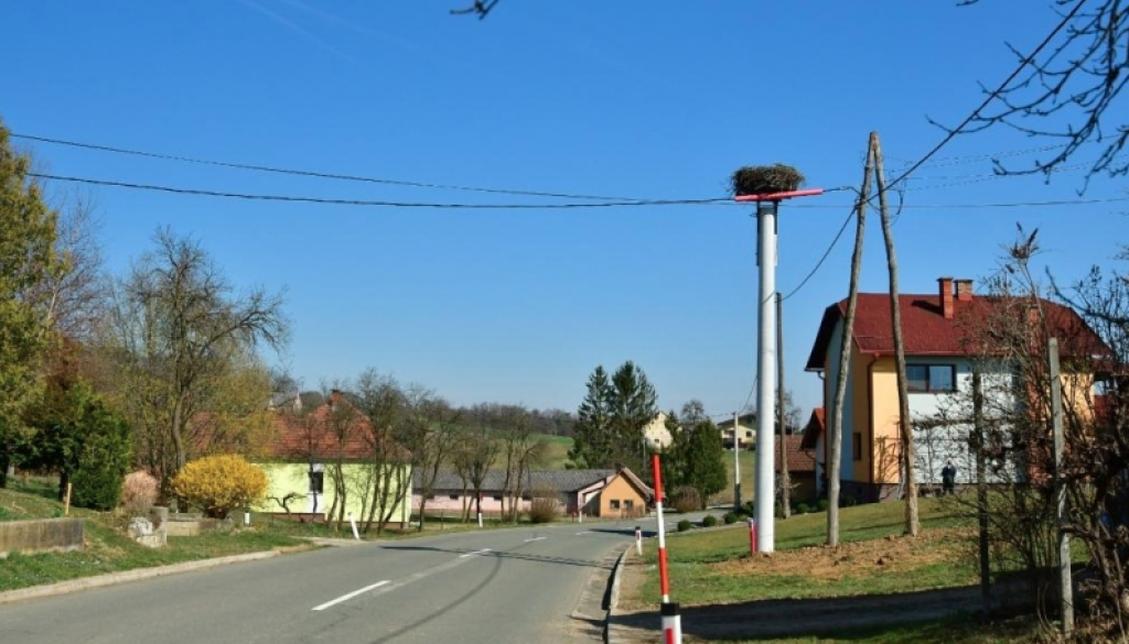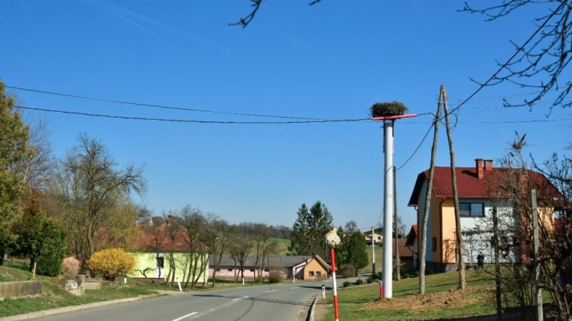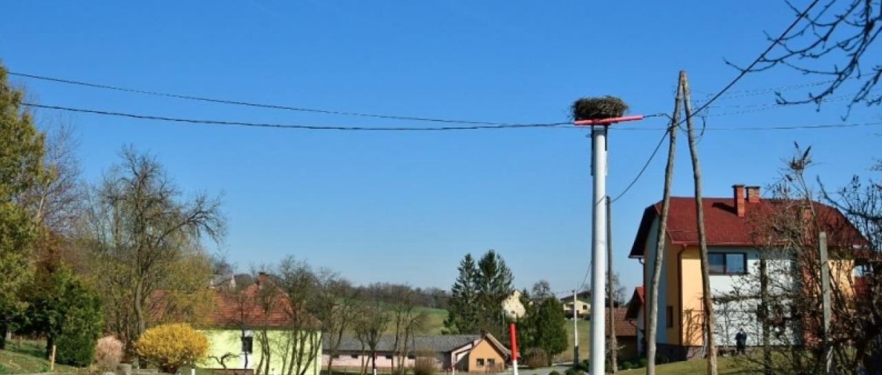 Zaposleni v Krajinskem parku Goričko in delavci Elektra so poskrbeli za varno gnezdenje štorkelj na električnem drogu.