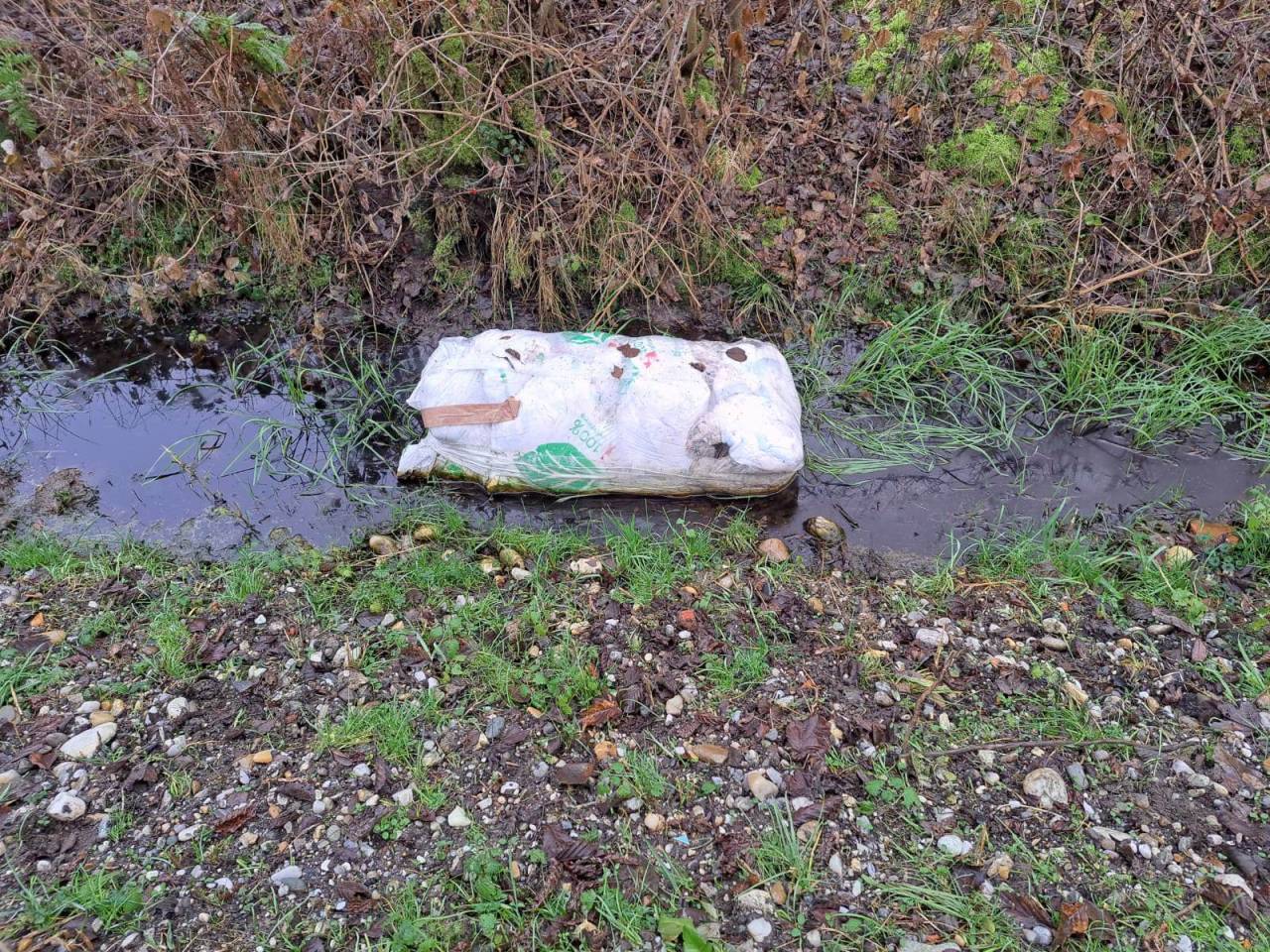 Na gramozni poti iz Črenšovcev proti Srednji Bistrici so nepridipravi v grabo odvrgli večjo količino svinjske kože in veliko plastično vrečo plenic.