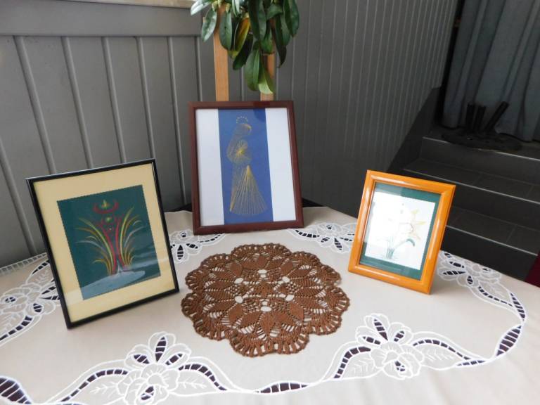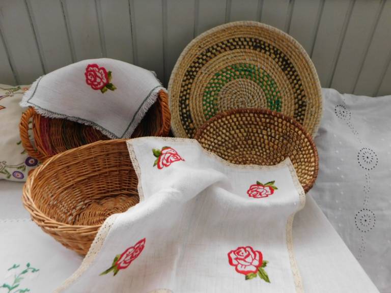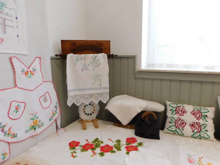 Babičina skrinja je na ogled ponujala razne prte, prtičke in zidne slike, ki so bile našite z različnimi verzi. Te zidne slike so bile nekoč obešene v kuhinji nad štedilnikom.