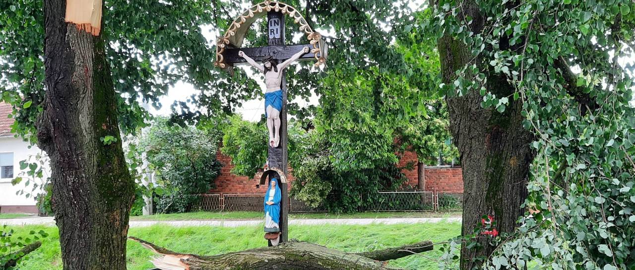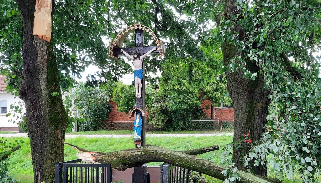 Zadnje neurje je pustošilo tudi v Dobrovniku, odtrgana veja je le za las zgrešila obnovljen križ.