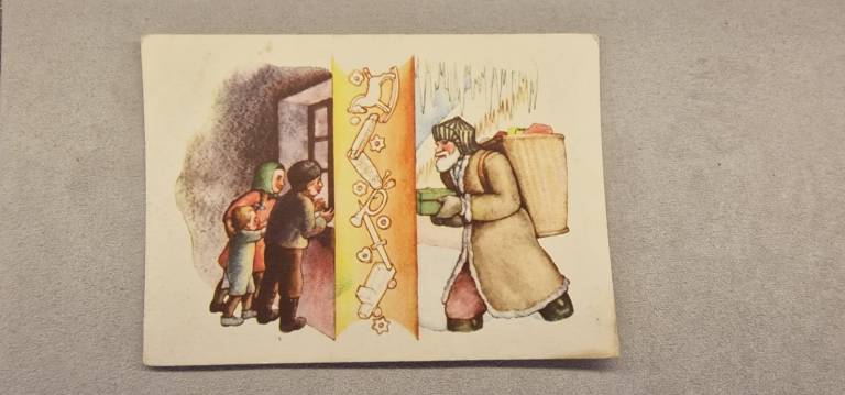 Razstavljene voščilnice prikazujejo značilne zimske motive, kot so zasnežene pokrajine, sveče, smrečje, okraski, praznične mize in pravljične ilustracije.