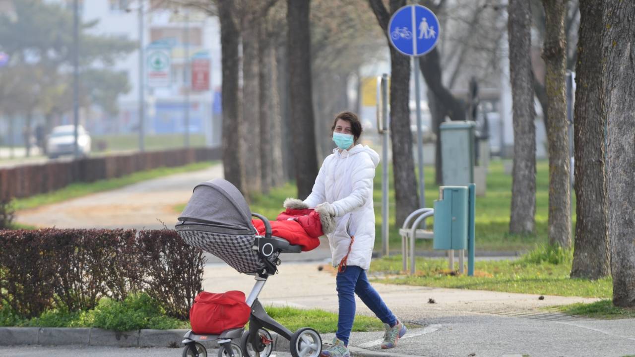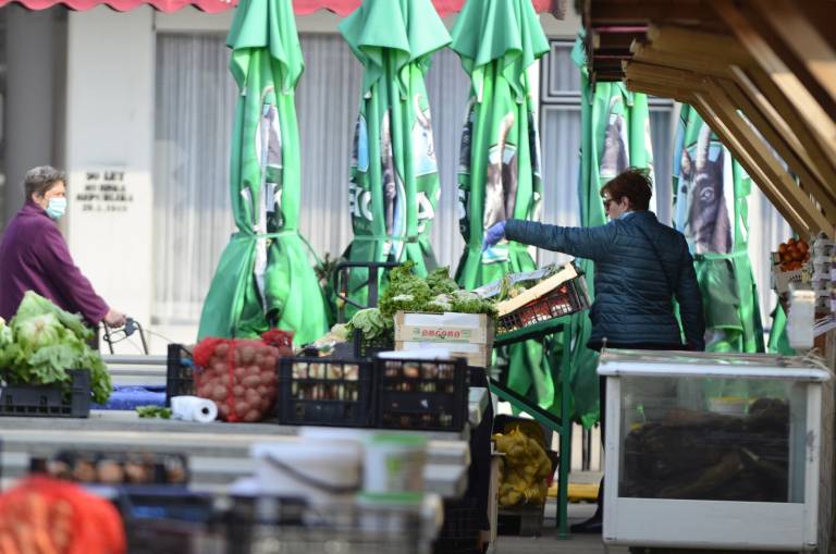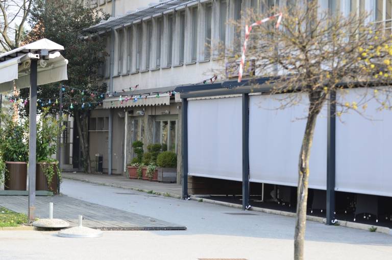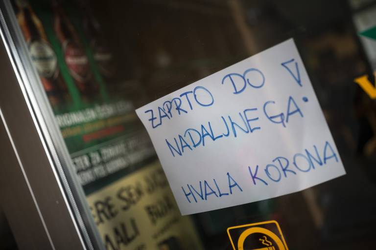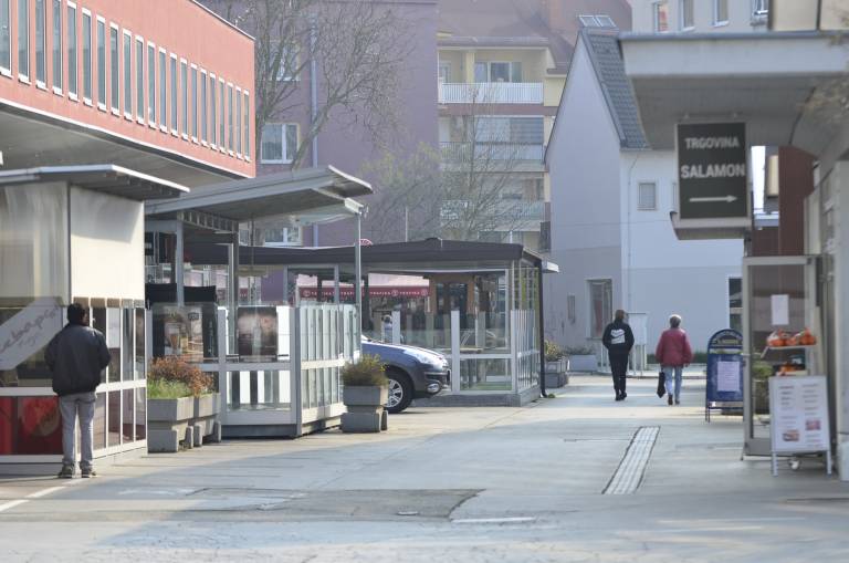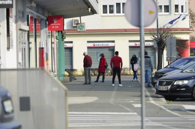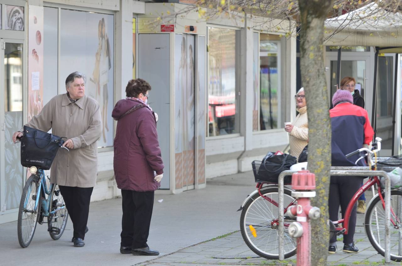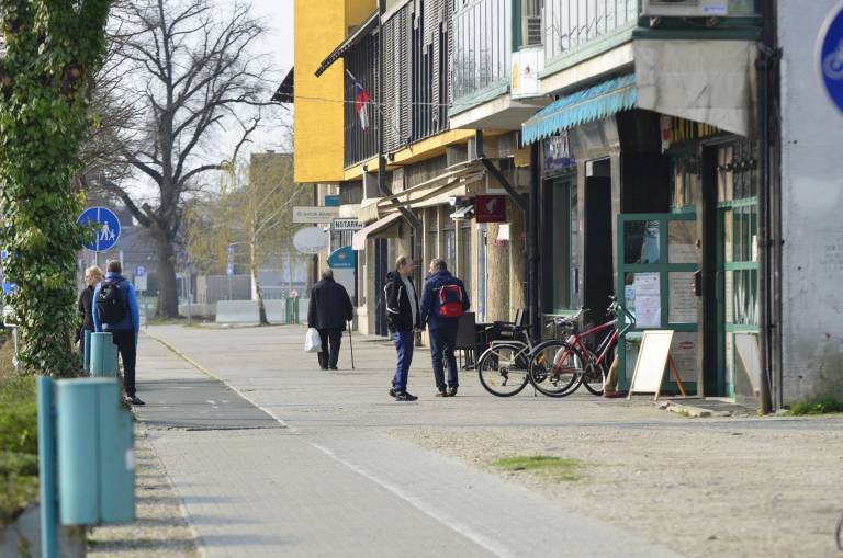 Gostinski lokali so zaprti. Pred pekarno in lekarno ljudje stojijo v varnih razmakih.