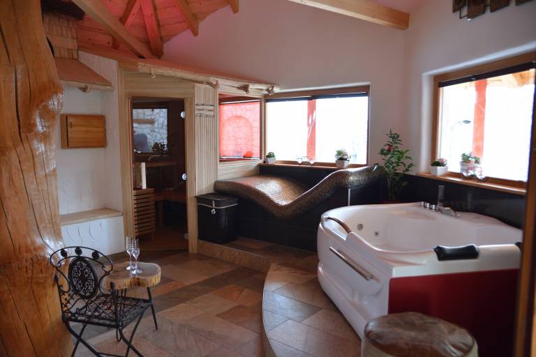 Posebnost je odprt prostor s češnjo na sredi, ki drži vse tramove. Prostor je zaznamovan z naravnimi materiali, kot so les, kamen in glina. Wellness obkroža narava, tako da ni nič čudnega, če gostje v daljavi slišijo lajež jelenov, petje ptic, mimo pa se sprehodijo tudi štorklje.