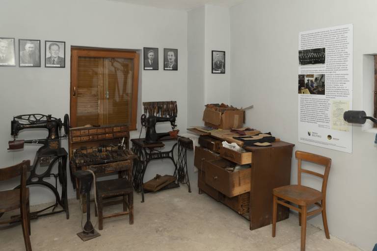 Za ogled so na voljo šivalni stroj, delovna miza, lesena kopita, usnje, kladiva, leseni in kovinski žebljički, risbe in načrti za izdelovanje čevljev.