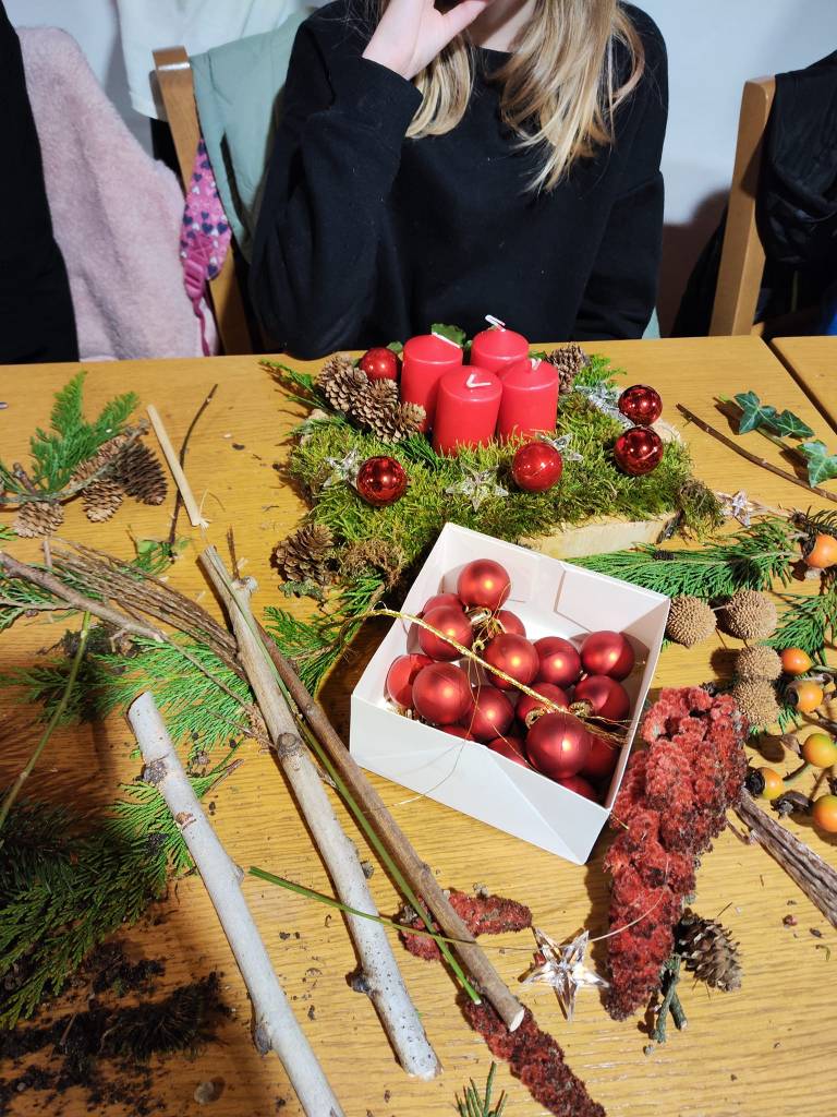 Material za izdelovanje venčkov so nabrali v naravi (v gozdu, na travniku) ter doma. Vso gradivo so nato prinesli v toplo cimprano hišo, kjer so se pridne otroške roke ob pomoči domačinov lotile izdelovanja adventnih venčkov.