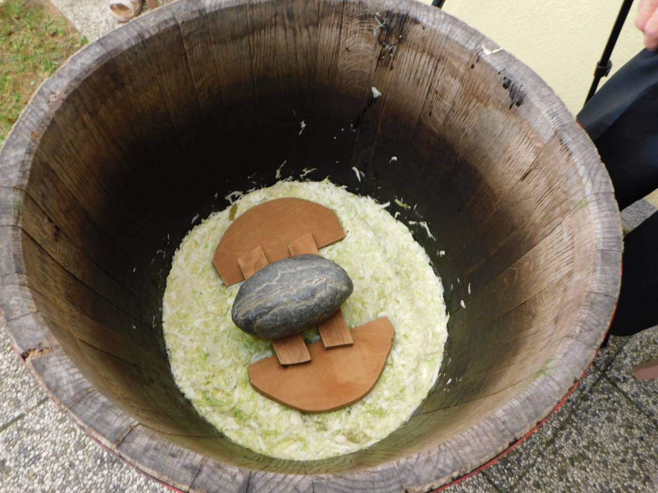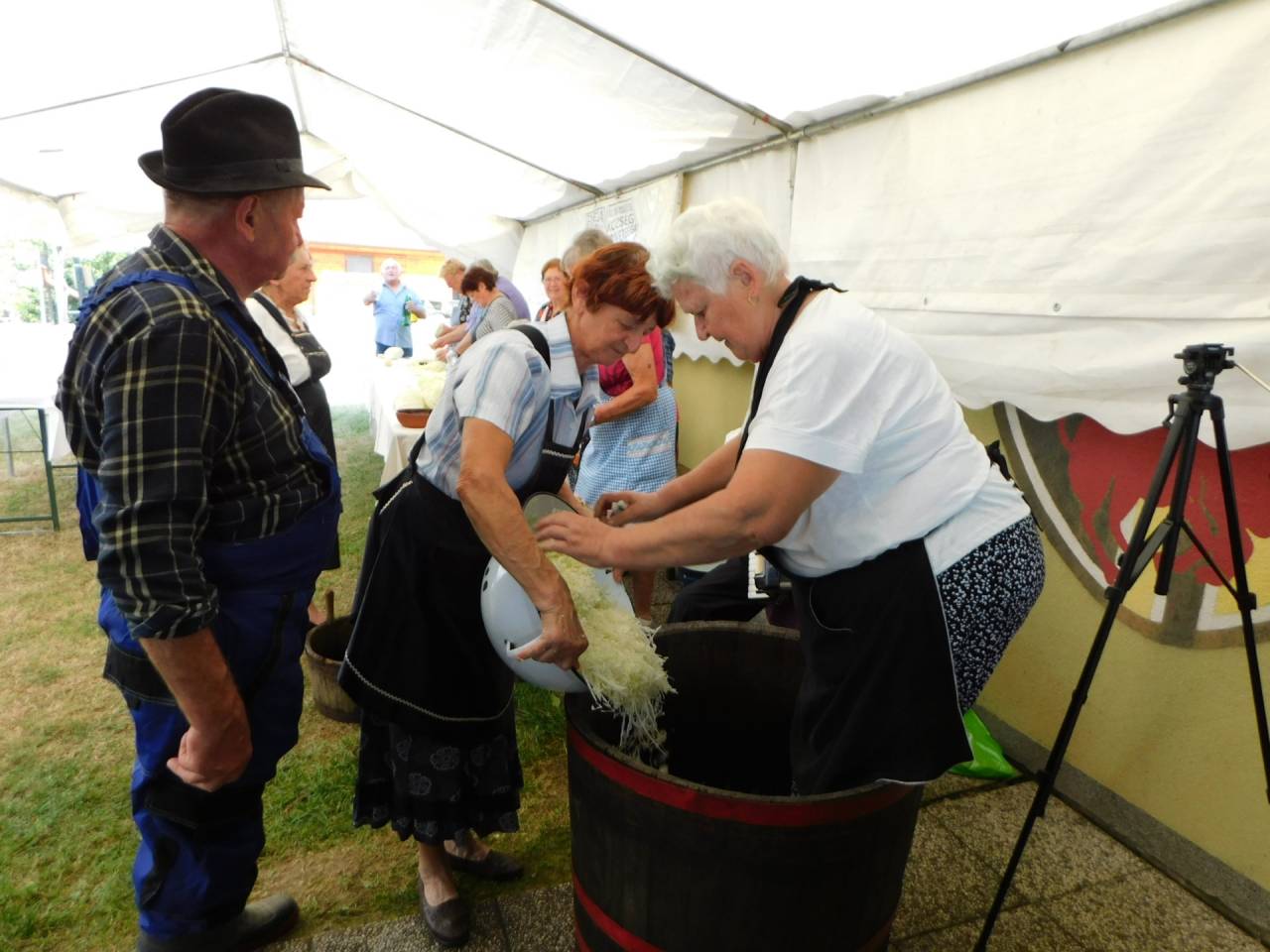 Članice društva so prikazale čiščenje zelja z noži in srpačami, ribanje zelja na ročnem ribašu ter tlačenje in kisanje zelja v leseni kadi.