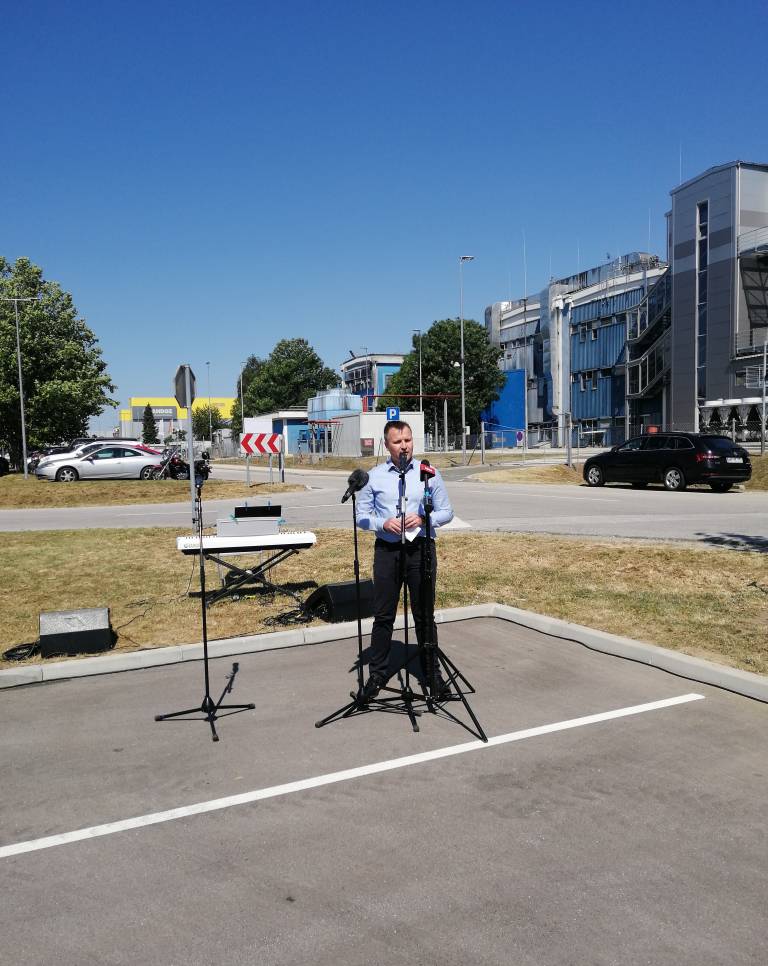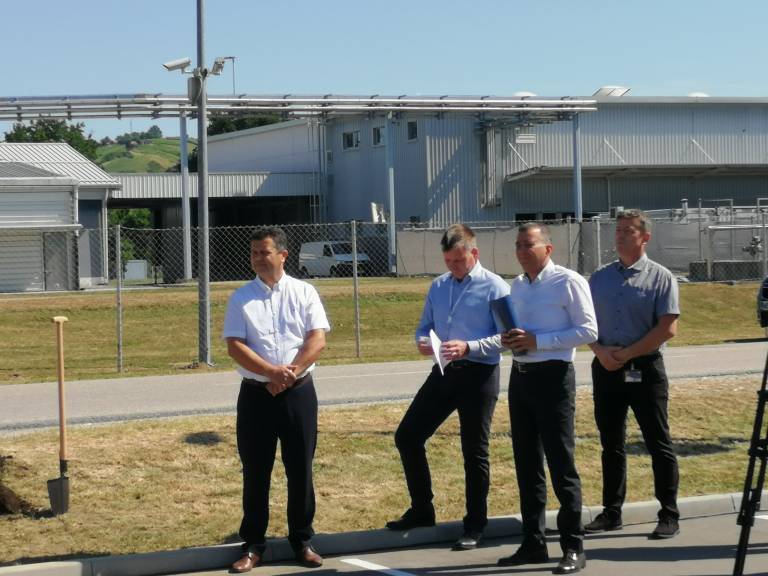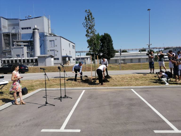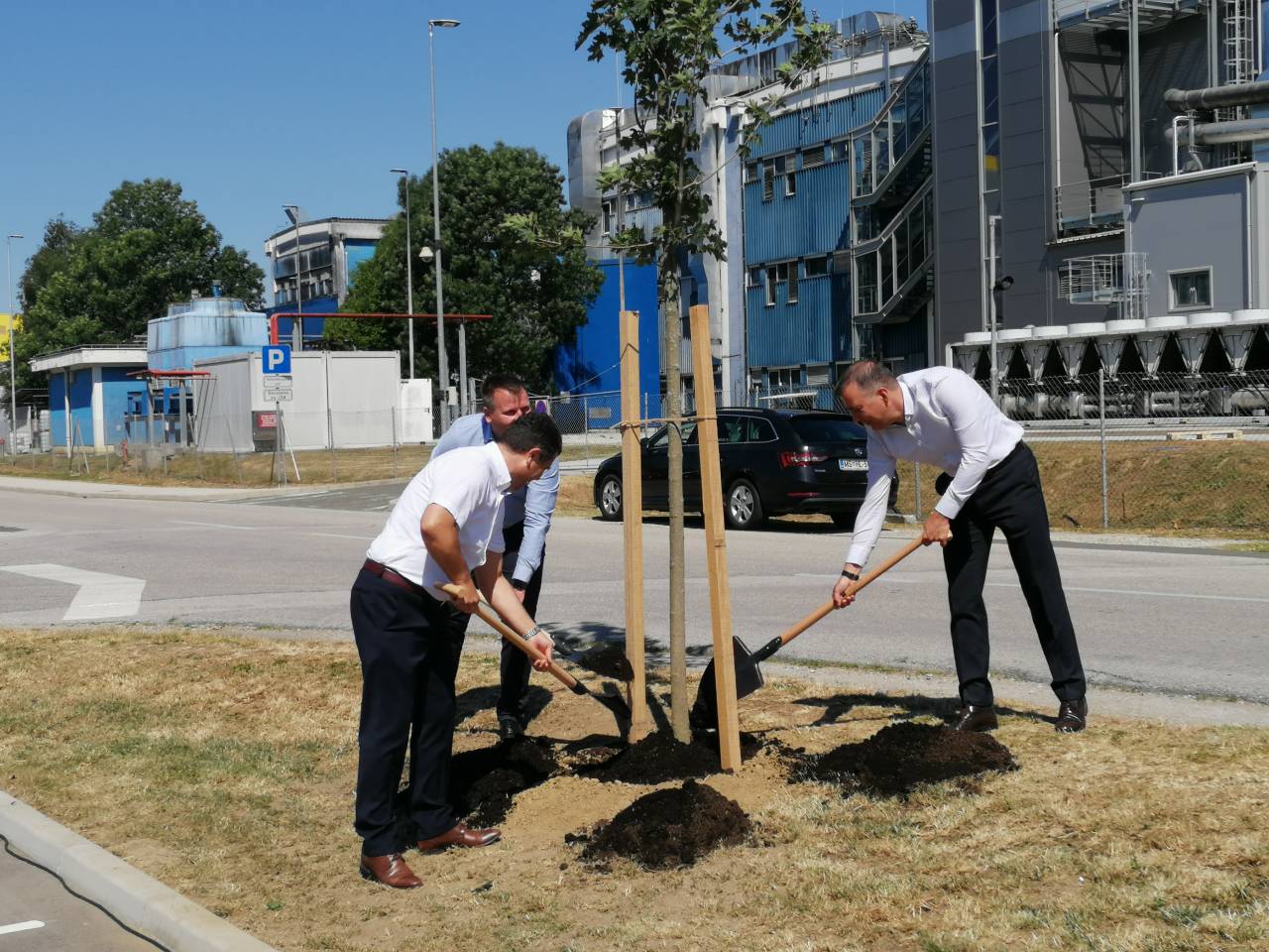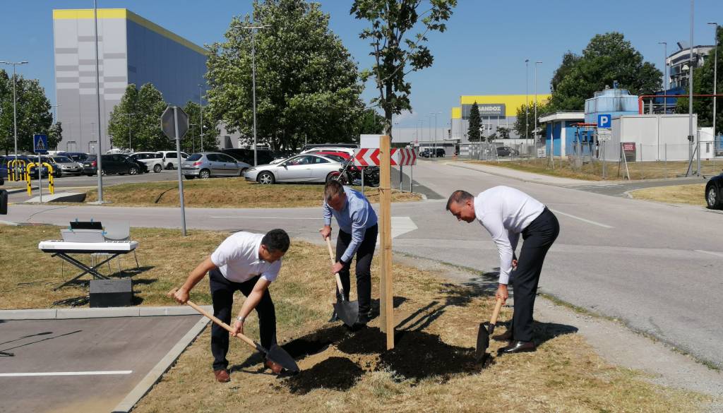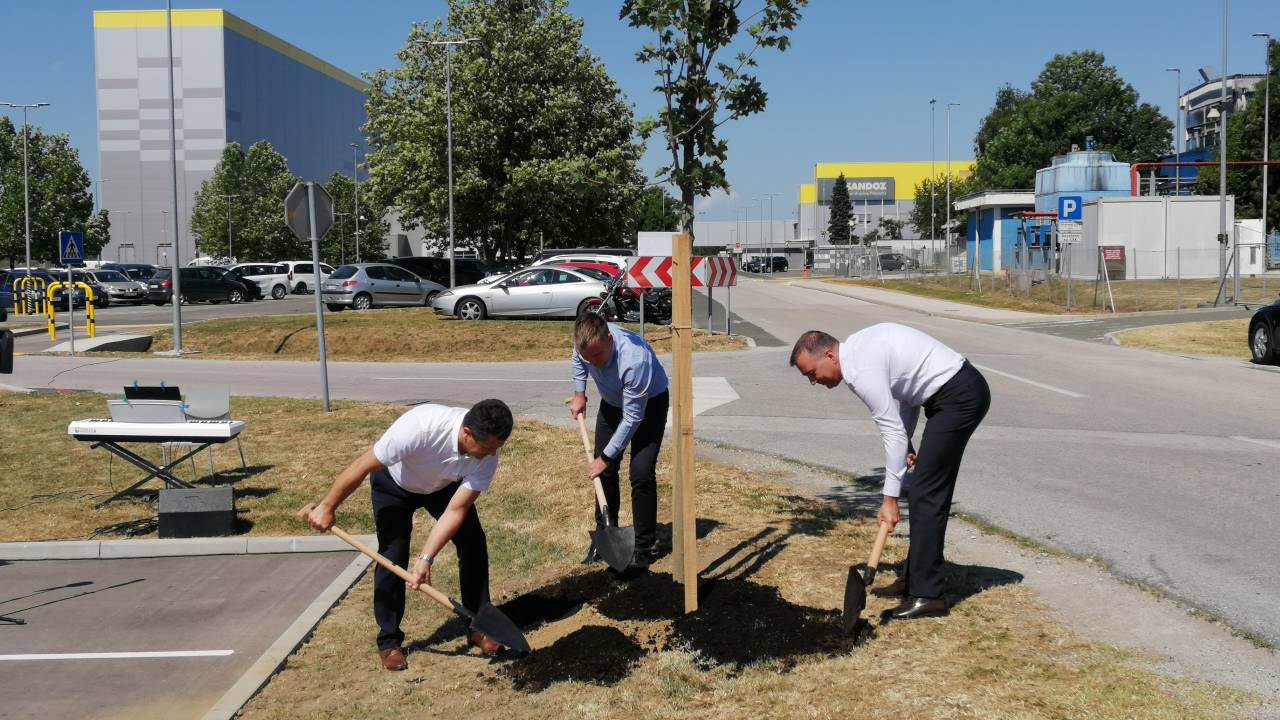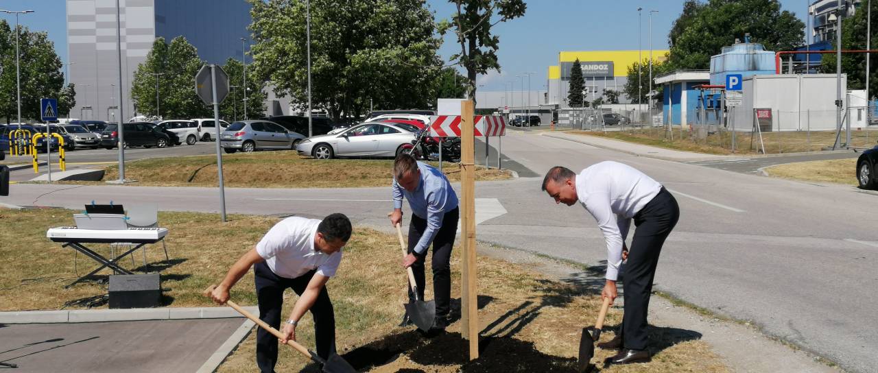 Ob začetku delovanja Zelenega tima, ki bo širil kulturo okoljske trajnosti v Novartisu v Lendavi, so Janez Magyar, župan Občine Lendava, Robert Ljoljo, predsednik uprave Leka d.d. in Novartisa v Sloveniji, ter Simon Rečnik, direktor Trdnih izdelkov Lendava, skupaj posadili drevo prijateljstva.