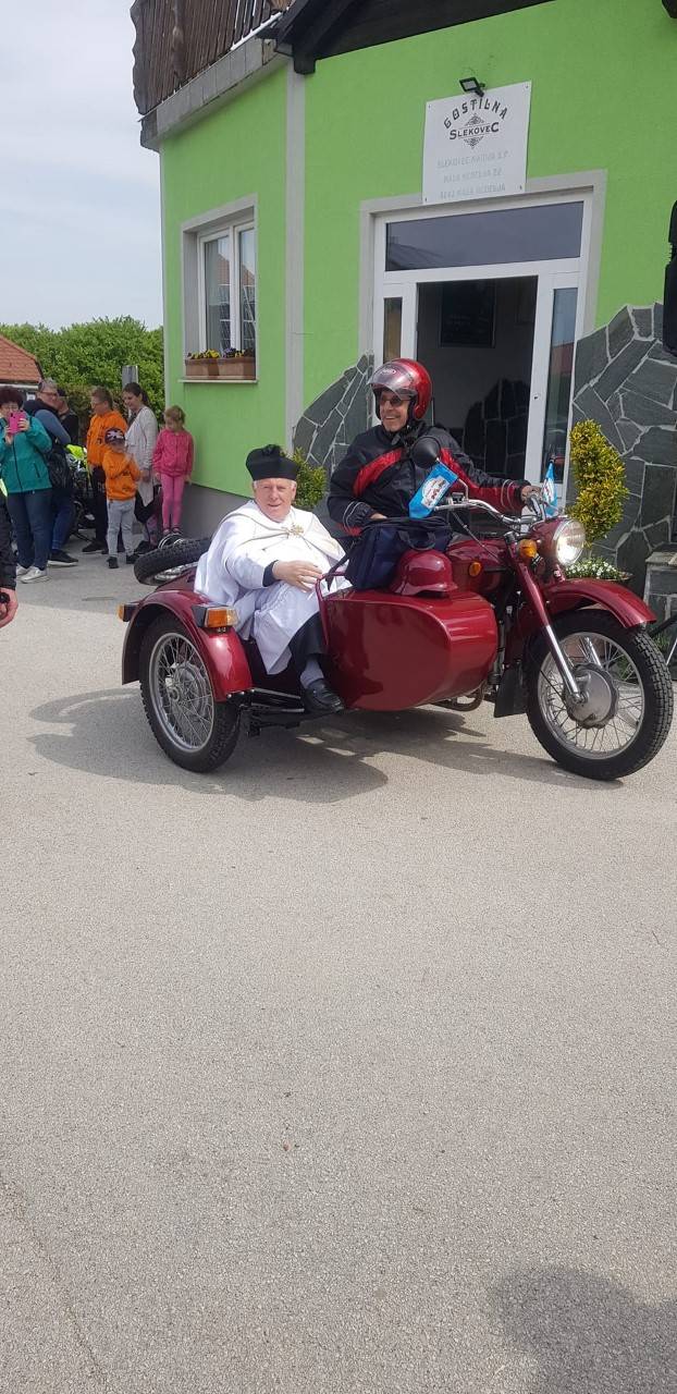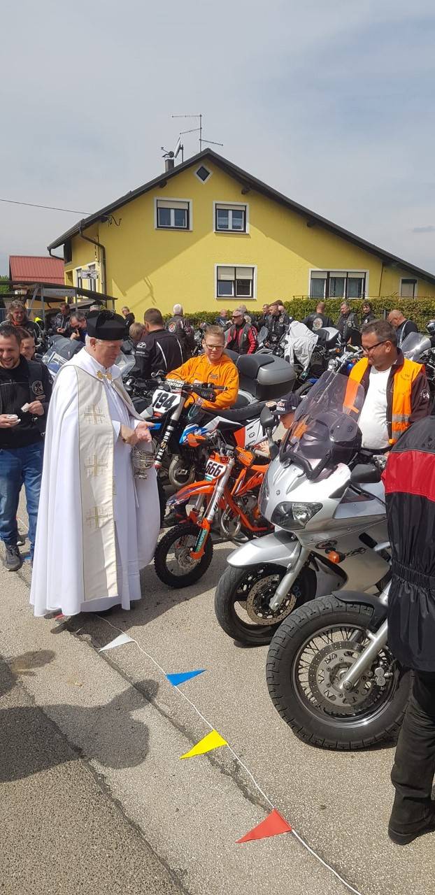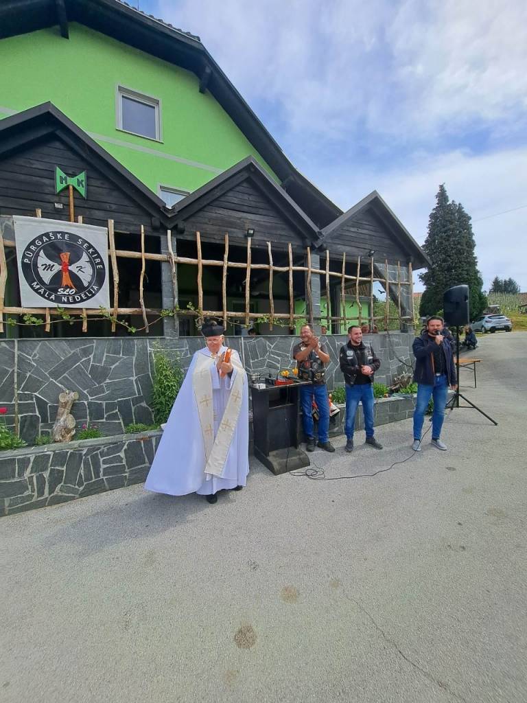 Motorje in motoriste je blagoslovil župnik župnije Mala Nedelja Srečko Fras, kateri se je na blagoslov pripeljal kar v rdečem dvosedu in prijetno presenetil vse zbrane.